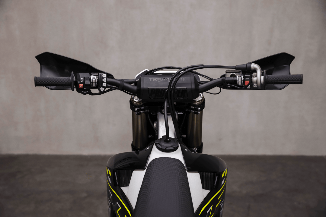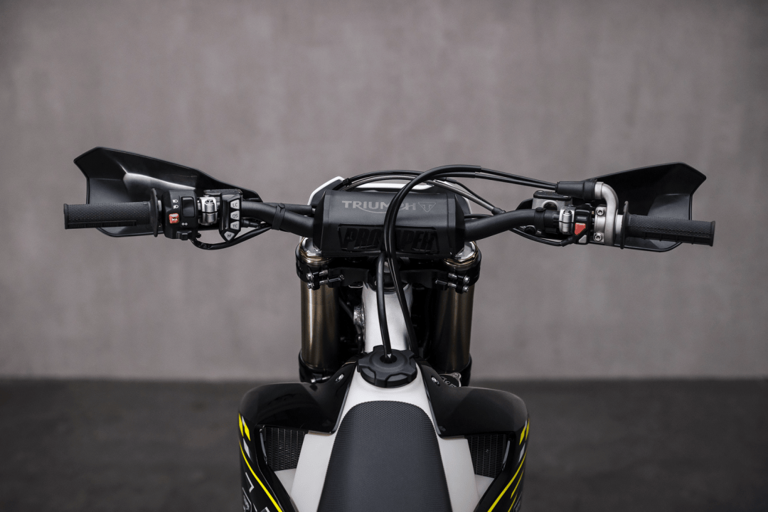 5、發(fā)動(dòng)機(jī)電子管理系統(tǒng)提供兩個(gè)快速可選的油圖、以適應(yīng)不同的比賽環(huán)境,騎士可通過車把上的開關(guān)按鍵進(jìn)行快速切換,兩個(gè)油圖里,其中一個(gè)對(duì)應(yīng)激進(jìn)的輸出性能,另一個(gè)則對(duì)應(yīng)更平穩(wěn)、更可控的動(dòng)力輸出特性。此外,用戶還可以使用可額外選購的 Wi-Fi 模塊,通過應(yīng)用程序 Triumph MX Tune Pro 來添加其他的預(yù)設(shè)油圖;