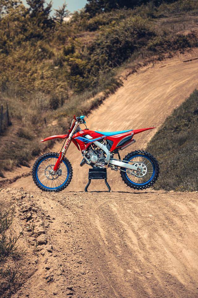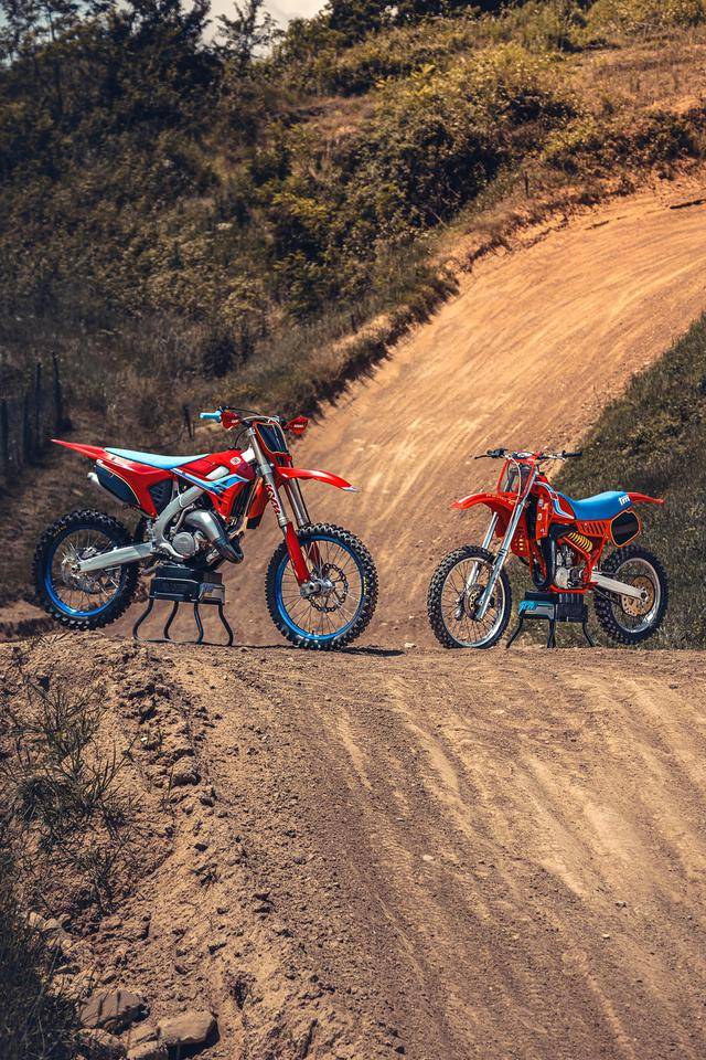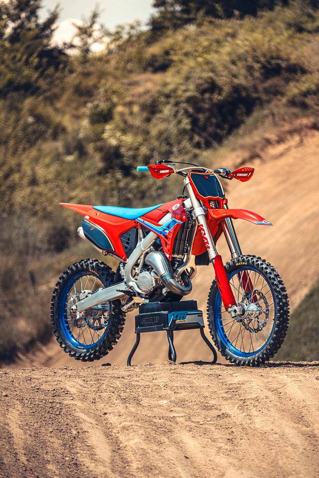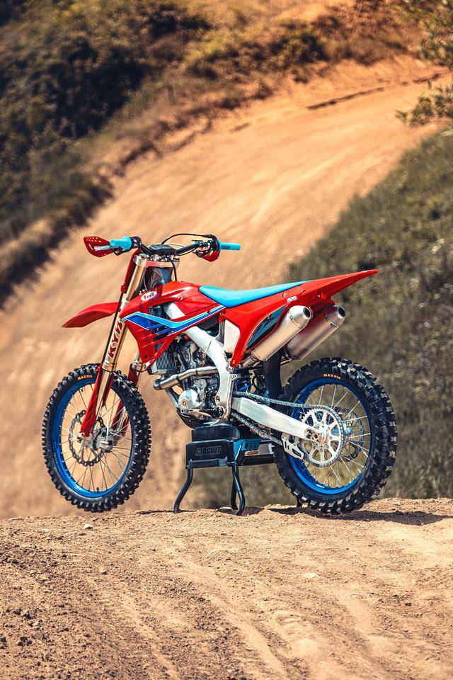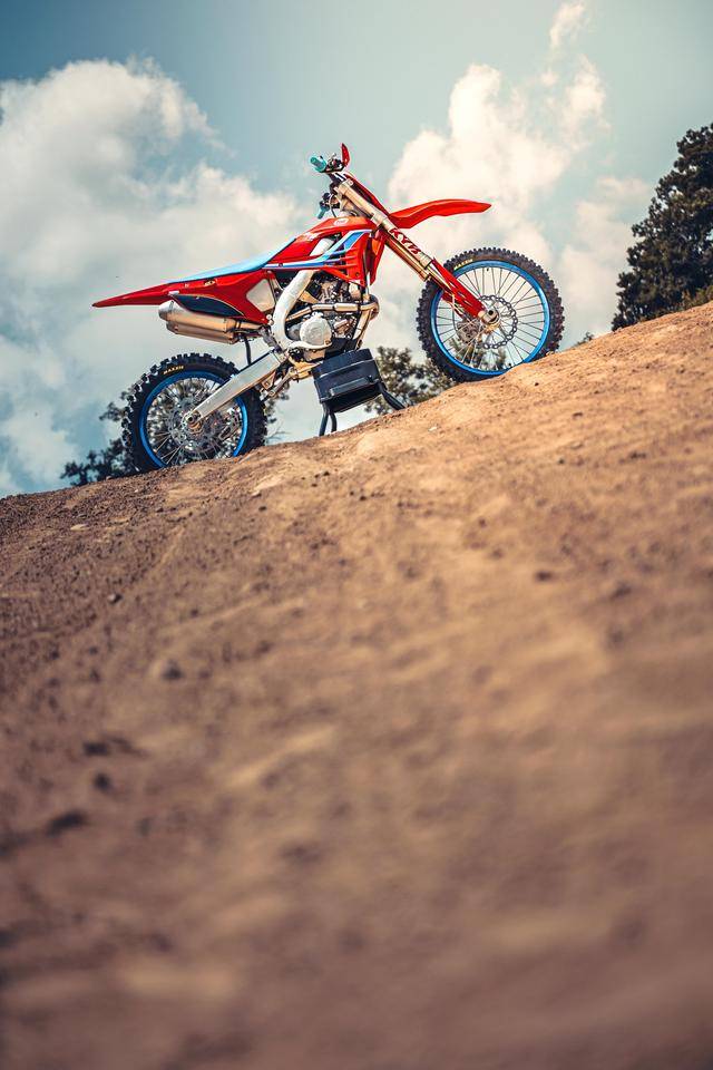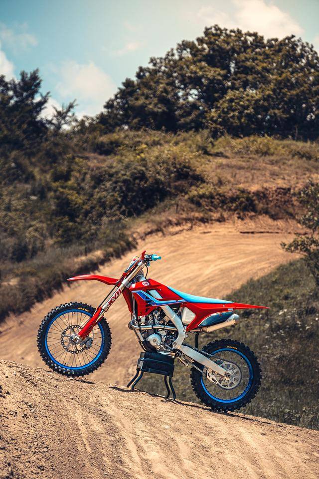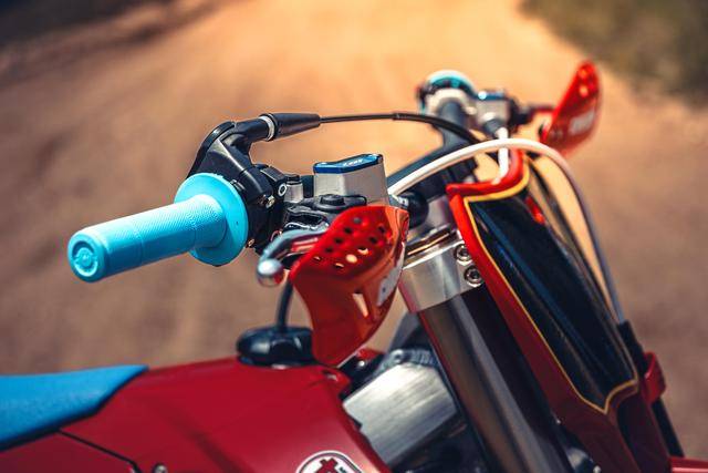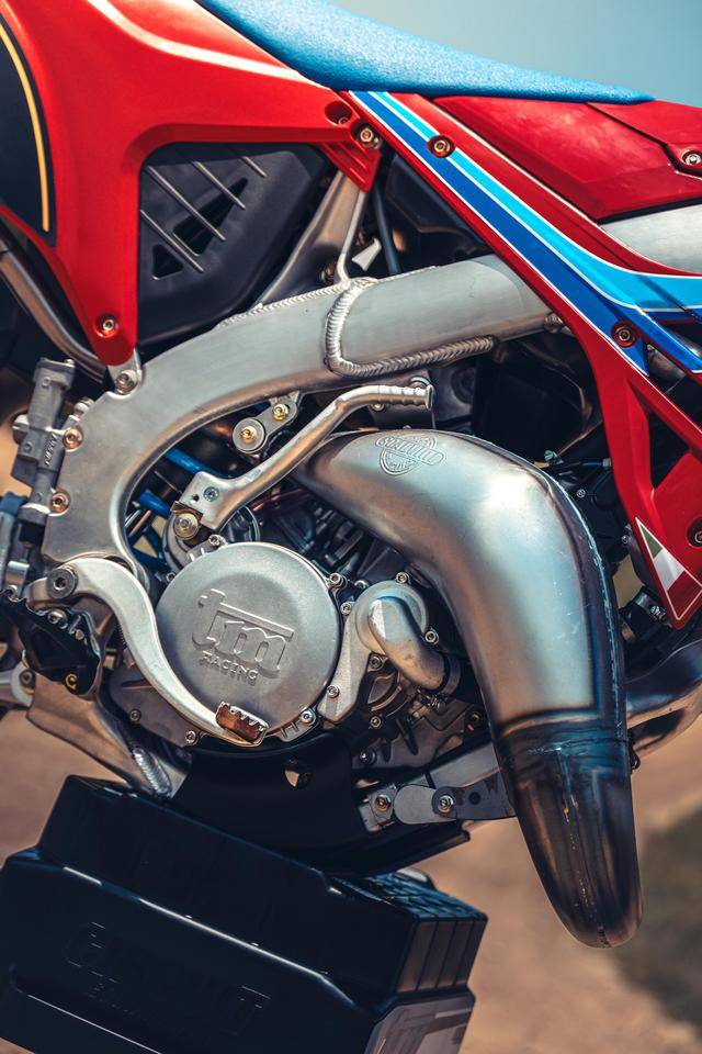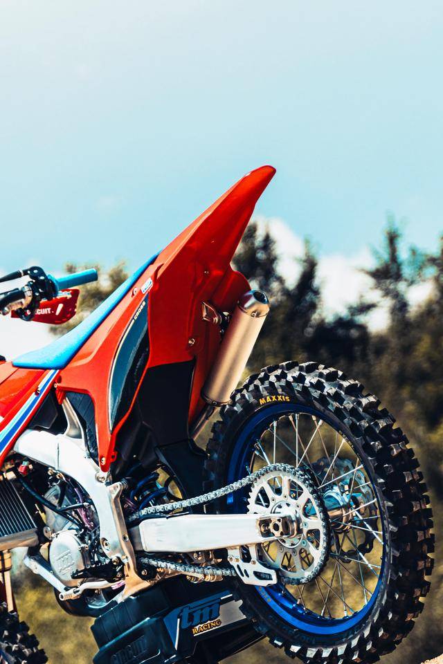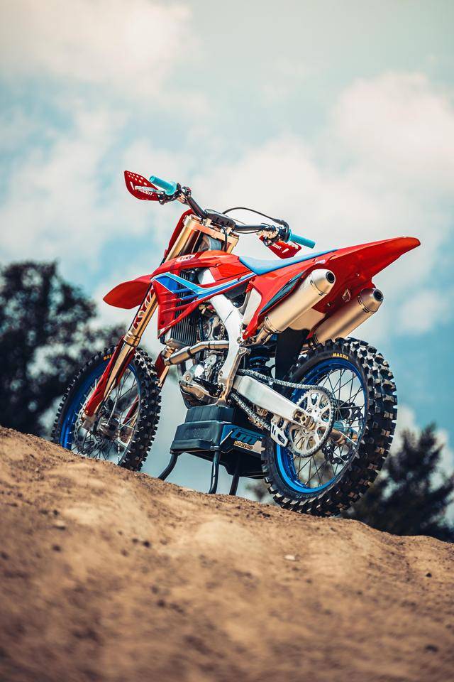 除了紅色的車身圖案,TM 標(biāo)志性的藍(lán)色、也用于鞍座和前輪車輪,從而讓該系列的 2025 夢想限量版既帶有最初的色彩、也有著近現(xiàn)代的元素。而全部限量版車型均采用了鋁合金制的雙翼樑式車架,則是 TM 在全尺寸越野賽車?yán)锩娴臉?biāo)志。