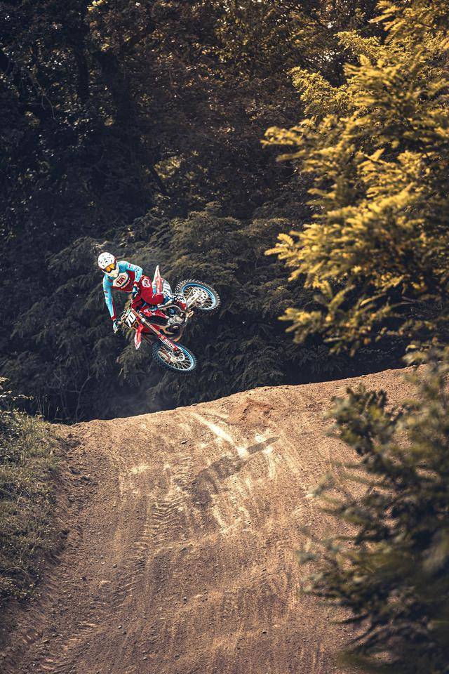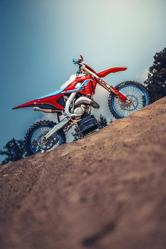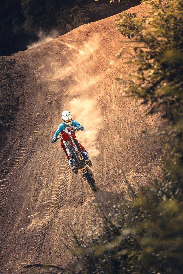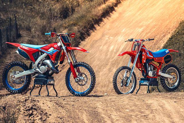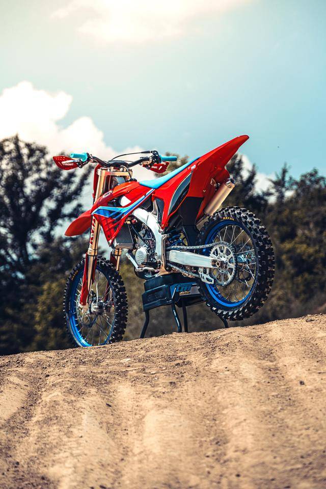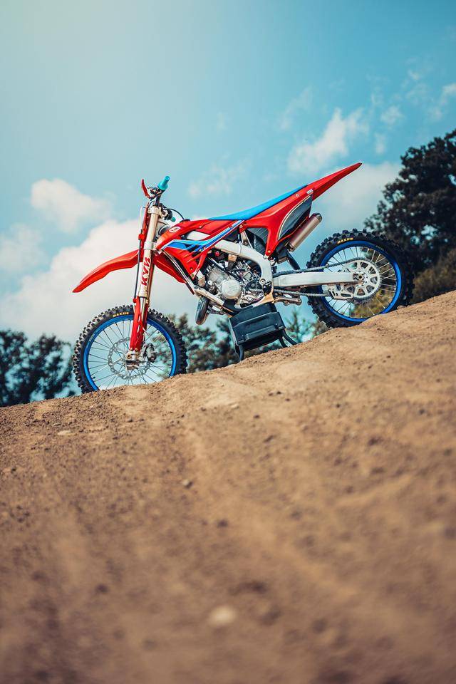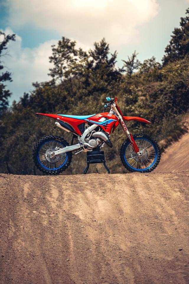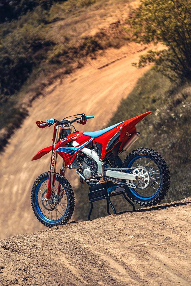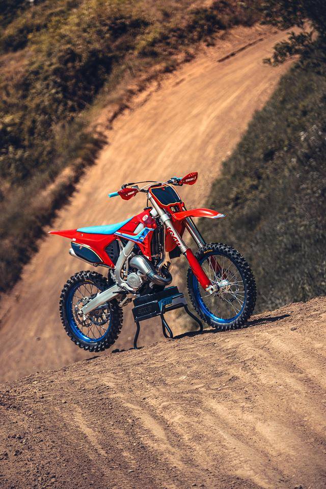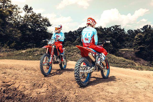 除了紅色的車身圖案,TM 標(biāo)志性的藍(lán)色、也用于鞍座和前輪車輪,從而讓該系列的 2025 夢想限量版既帶有最初的色彩、也有著近現(xiàn)代的元素。而全部限量版車型均采用了鋁合金制的雙翼樑式車架,則是 TM 在全尺寸越野賽車?yán)锩娴臉?biāo)志。