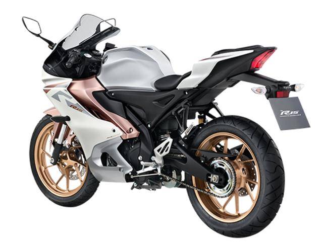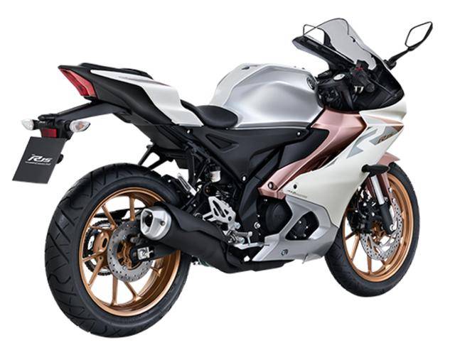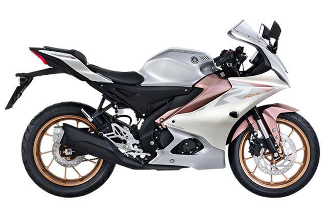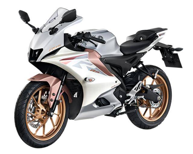 Futuristic White配色的YZF-R15采用了獨(dú)特的色彩搭配,將冷色調(diào)的銀白色與暖白色的細(xì)節(jié)相結(jié)合,營(yíng)造出一種珍珠般的細(xì)膩質(zhì)感。車頭整流罩、車身下部以及油箱均采用了這種銀白色調(diào),而側(cè)整流罩則以暖白色為主,搭配玫瑰金質(zhì)感的側(cè)殼和前擋泥板涂裝,讓整車在陽(yáng)光下顯得格外耀眼。金色輪圈的加入,更是為這款摩托車增添了幾分奢華感,使其在視覺(jué)上更具沖擊力。