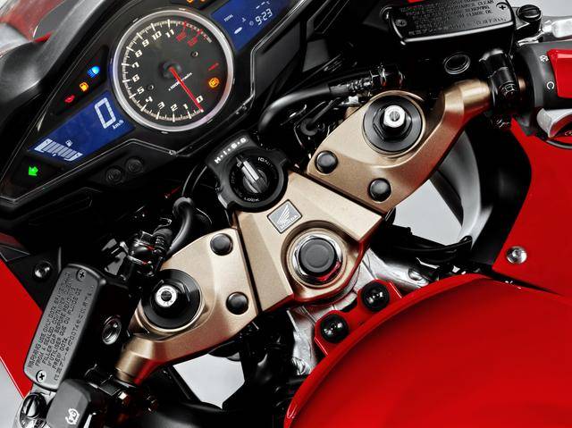 9、車體也采用了全新的設計,除了全新的外觀造型,還有首次應用到該車的、承載式設計(以發(fā)動機作為承重構件之一)的鋁合金制雙翼樑式車架,帶 ECU 控制前后剎車聯(lián)動、對向六活塞的前剎車卡鉗,這款新的 VFR800F 稱得上是集當時各項最新技術成果于一體的車型;
