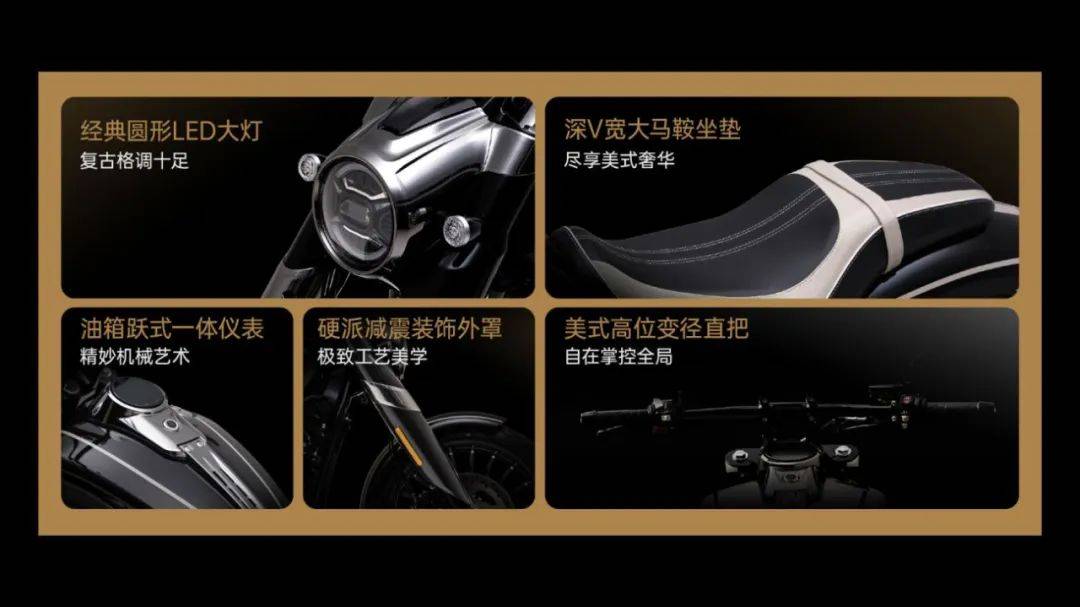 YES 418配備同級(jí)罕見(jiàn)的180mm超寬后胎設(shè)計(jì),搭配前19后17寸復(fù)古造型的高強(qiáng)度輻條,抓地力提升40%,壓彎過(guò)水穩(wěn)如磐石,兼顧復(fù)雜地形通過(guò)性與顏值需求。再有美式經(jīng)典巡航元素,如圓形LED大燈、鍍鉻發(fā)動(dòng)機(jī)裝飾、高位變徑直把等,回頭率拉滿。