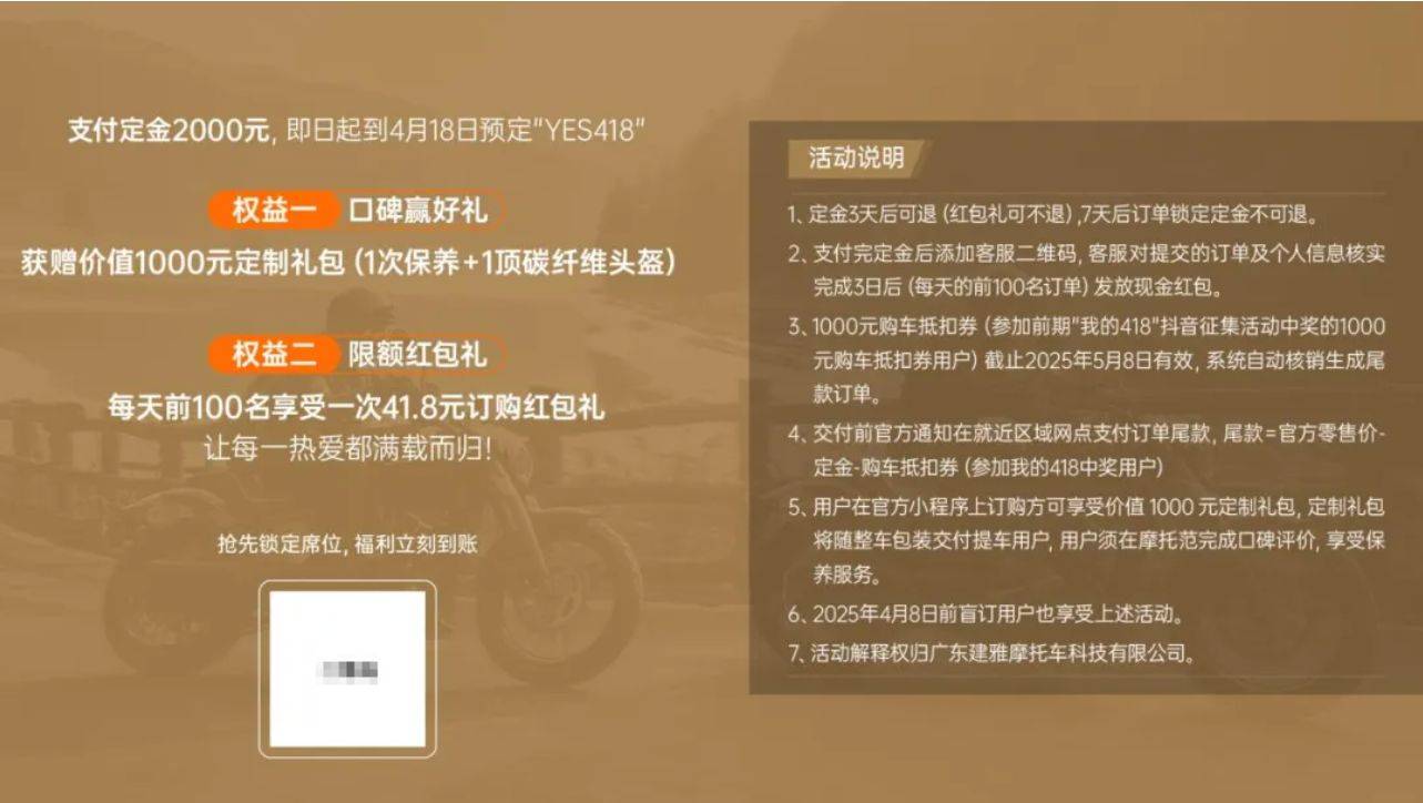 即日起至4月18日,用戶支付2000元定金即可享價(jià)值千元定制禮包及每日限額紅包禮兩大權(quán)益,針對(duì)前期參與“我的418”抖音征集,活動(dòng)中獎(jiǎng)用戶,還可享受1000元購(gòu)車(chē)抵扣劵。