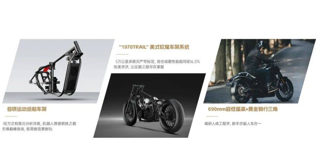 與之匹配的自研運(yùn)動(dòng)巡航車(chē)架,通過(guò)萬(wàn)次有限元分析和機(jī)器人焊接,剛性提升30%,彎道支撐力同級(jí)領(lǐng)先。還搭載同級(jí)唯一“1970TRAIL”軟尾系統(tǒng)(中央減震+多連桿結(jié)構(gòu)),綜合減震性能超同級(jí)16.5%,爛路如履平地,并經(jīng)過(guò)5萬(wàn)公里多路況驗(yàn)證。搭配690mm超低座高加深V馬鞍坐墊的黃金騎行三角,165cm身高也能雙腳著地,新手亦能人車(chē)合一。