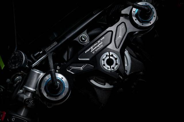 Panigale V4 Lamborghini搭載了Ducati標志性的1103mL Desmosedici Stradale V4發(fā)動機,經(jīng)過特別調(diào)校,最大馬力提升至218.5·HP,峰值扭矩為122.1N·m。得益于Akrapovi?鈦合金排氣系統(tǒng)和大量碳纖維部件的使用,整車重量減輕至185公斤,實現(xiàn)了1.18HP/kg的重量功率比。