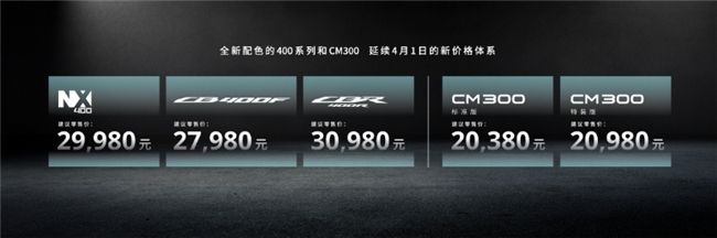除了400系列車型全新配色方案外,Honda還發(fā)布了CM300特裝版,新增大燈燈罩、菱格紋坐墊,并在摩登灰車身上加入薄荷綠線條,官方建議零售價為20,980元。而400系列新配色和CM300標(biāo)準(zhǔn)版車型將延續(xù)4月1日實施的新價格體系。