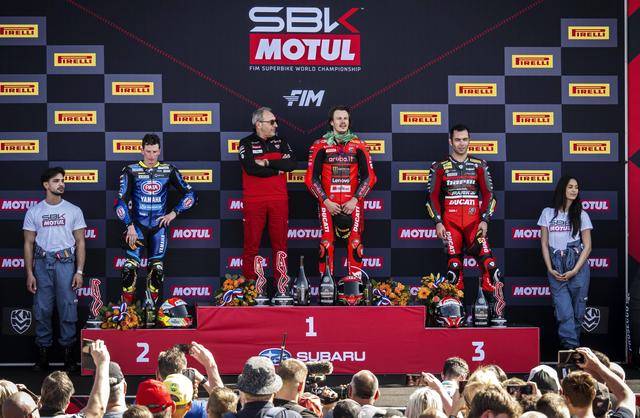 賽程為 10 圈的 Super Pole Race 超級(jí)排位賽正賽、在濕地之下展開(kāi),拉格里奧盧以接近 4 秒的優(yōu)勢(shì)、輕松奪得了第一;小洛維斯、19 號(hào)車的西班牙車手捌弟(Alvaro Bautista,巴迪斯塔)分別拿到了第二、第三。