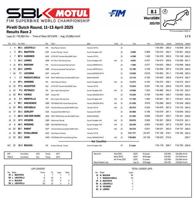 從第 11 圈開(kāi)始就一直尾隨在后的洛卡泰利,最終奪得了第二節(jié)比賽的冠軍 —— 這是他在 WorldSBK 最高級(jí)別過(guò)去 153 節(jié)比賽里的首個(gè)冠軍,同時(shí)也是 YZF-R1 自 2023 年的法國(guó)站以來(lái)、時(shí)隔一年多之后,打破 “ 冠軍荒 ” 的勝利。