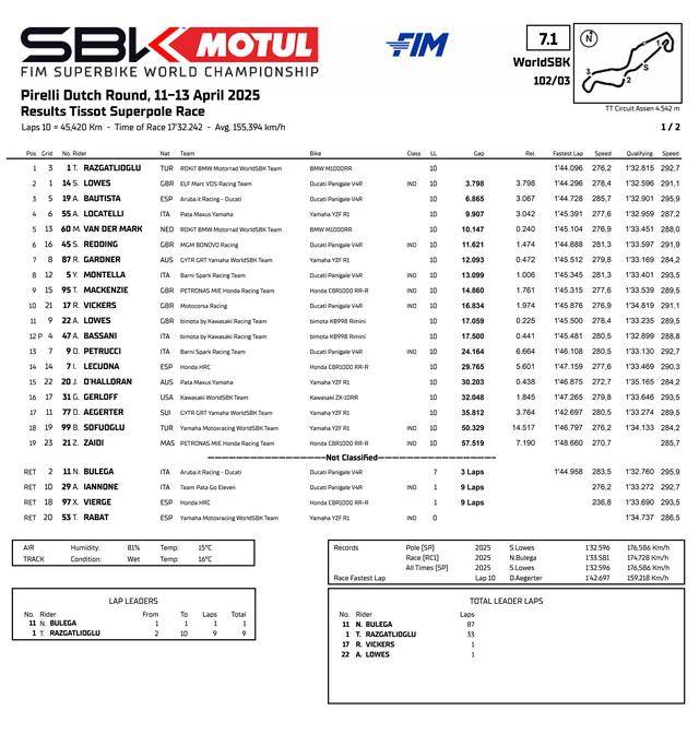WSBK 級(jí)別、賽前的 Super Pole 超級(jí)排位賽,來(lái)自獨(dú)立車隊(duì)、駕駛 14 號(hào)車的英國(guó)車手小洛維斯(Sam Lowes。他的哥哥 Alex Lowes 大洛維斯在 bKRT 車隊(duì)),刷出了一個(gè)破圈速紀(jì)錄的 1 分 32.596 秒的時(shí)間(舊紀(jì)錄是 2022 年時(shí)的 1 分 32.934 秒),拿到了第一節(jié)正賽的排頭位出賽;后面,駕駛 11 號(hào)車的意大利車手布雷加(Nicolo Bulega),以及駕駛 1 號(hào)車的土耳其車手拉格里奧盧(Toprak Razgatlioglu),分別占據(jù)了第一排發(fā)車位置的另外兩席。