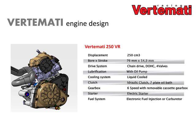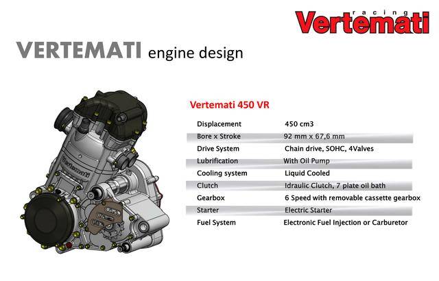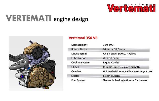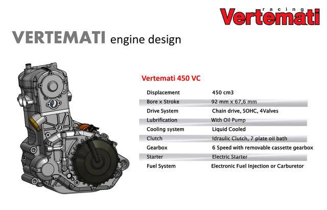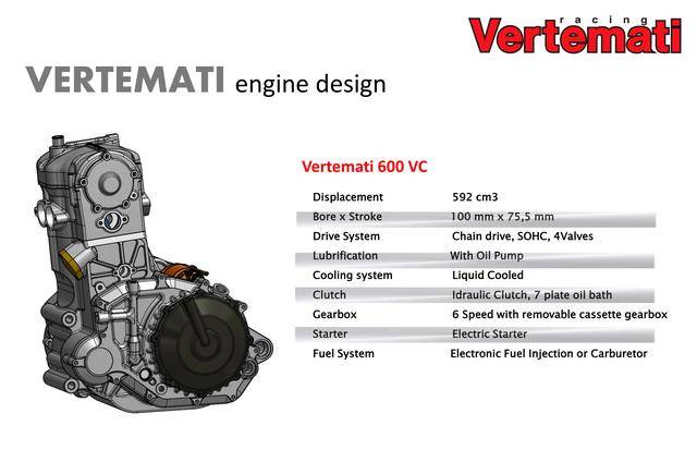 * 采用反向后傾式單氣缸布局的 VR 系列,有維特馬蒂 250 VR(DOHC 四氣閥)、維特馬蒂 350 VR(DOHC 四氣閥)、維特馬蒂 450 VR(SOHC 四氣閥)、維特馬蒂 600 VR(SOHC 四氣閥),共四個(gè)不同排氣量版本。車隊(duì)用來參加 S1GP 的 NV450(Nicot Vertemati 450)賽車,就是搭載 VR 系列的發(fā)動(dòng)機(jī);