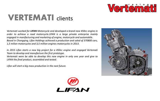 維特馬蒂公司創(chuàng)立于上世紀(jì)的六十年代,最初的業(yè)務(wù)是為部分的海外制造商設(shè)計(jì)、開發(fā)競技級(jí)組件;近年來的核心業(yè)務(wù),是高性能發(fā)動(dòng)機(jī)以至是整車的研究、開發(fā)和配套服務(wù)。該公司曾為包括中國制造商在內(nèi)的多個(gè)客戶、設(shè)計(jì)過高性能的單氣缸發(fā)動(dòng)機(jī),此外也曾制作過多款具意大利風(fēng)格的概念車、在 EICMA 米蘭車展亮相。