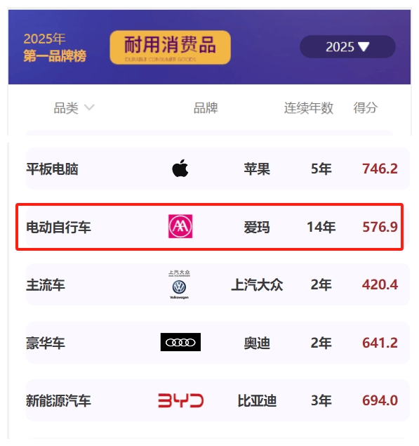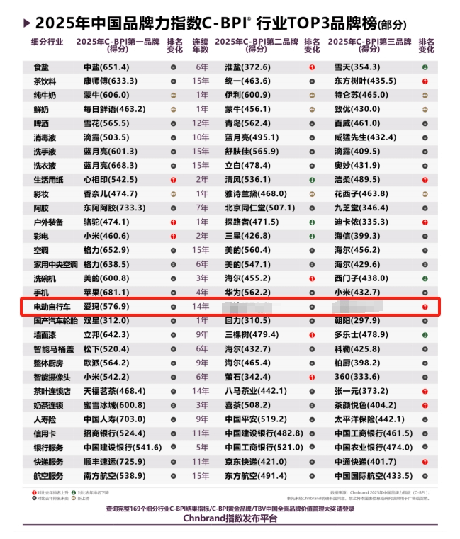 在工信部指導(dǎo)、中國品牌評(píng)級(jí)權(quán)威機(jī)構(gòu)Chnbrand發(fā)布的2025年C-BPI中國品牌力指數(shù)中,愛瑪連續(xù)第14年蟬聯(lián)電動(dòng)自行車行業(yè)品牌力榜首。這一數(shù)據(jù)不僅刷新了行業(yè)紀(jì)錄,更以斷層式優(yōu)勢(shì)印證了愛瑪在消費(fèi)心智占領(lǐng)、技術(shù)創(chuàng)新和可持續(xù)發(fā)展領(lǐng)域的系統(tǒng)性突破。