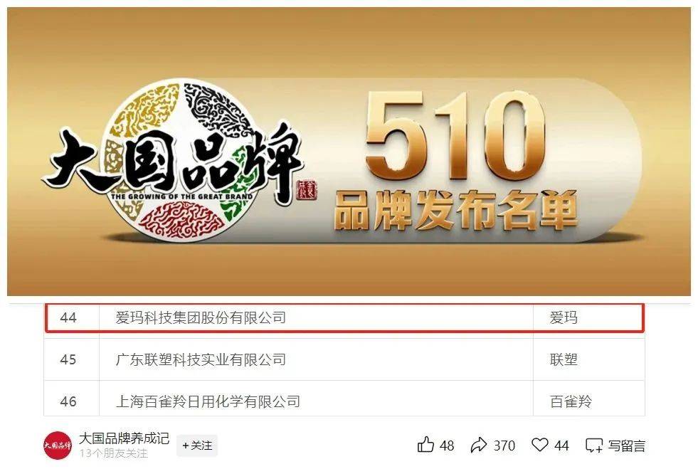 于此同時(shí),在中國品牌日這一國家品牌戰(zhàn)略的標(biāo)志性節(jié)點(diǎn)中,《大國品牌》510品牌名單重磅發(fā)布,愛瑪位列“中國可持續(xù)品牌100”名單第44名,以品牌長(zhǎng)遠(yuǎn)發(fā)展理念與社會(huì)責(zé)任擔(dān)當(dāng),成為綠色智造領(lǐng)域的標(biāo)桿。