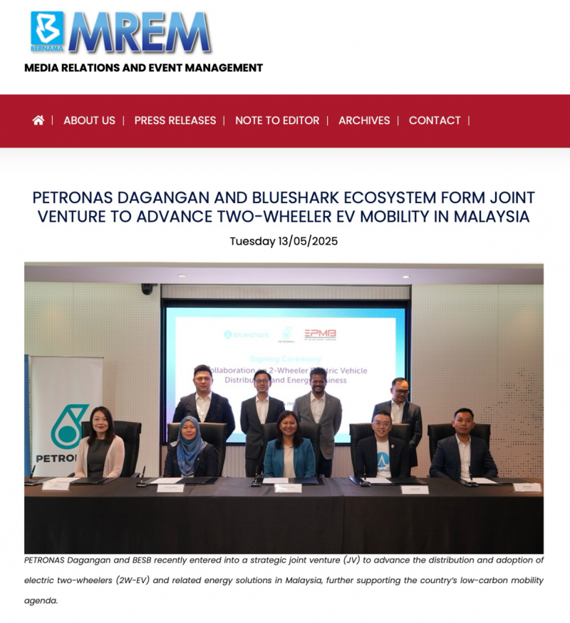 2025年5月9日,鯊灣科技馬來西亞子公司藍鯊生態(tài)系統(tǒng)有限公司(Blueshark Ecosystem Sdn. Bhd.,以下簡稱“BESB”)與東南亞石油巨頭馬來西亞國家石油貿(mào)易公司(PETRONAS Dagangan Berhad,以下簡稱“Petronas”)在吉隆坡正式簽署投資協(xié)議,并宣布成立戰(zhàn)略合資公司——藍鯊馬來西亞有限公司(Blueshark Malaysia Sdn. Bhd.,以下簡稱“BMSB”),共同推進新能源摩托車及能源補給解決方案在馬來西亞的普及。此次合作標(biāo)志著雙方自2022年建立戰(zhàn)略伙伴關(guān)系以來的全面升級。通過整合Petronas覆蓋全馬的加油站網(wǎng)絡(luò)與BESB的創(chuàng)新技術(shù)優(yōu)勢,加速實現(xiàn)馬來西亞國家能源轉(zhuǎn)型(NETR)目標(biāo)。