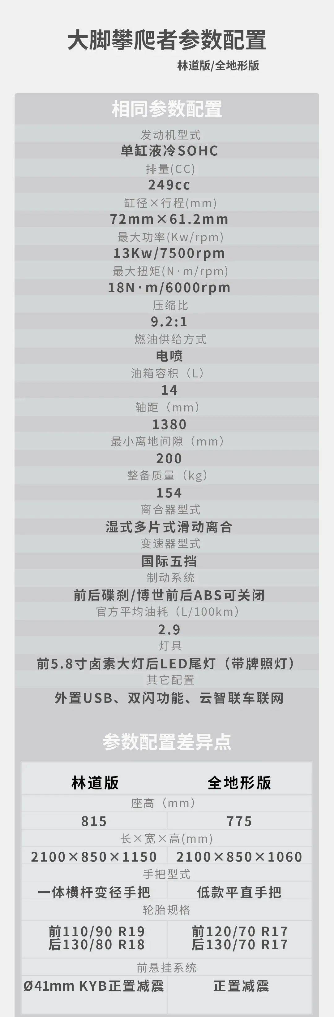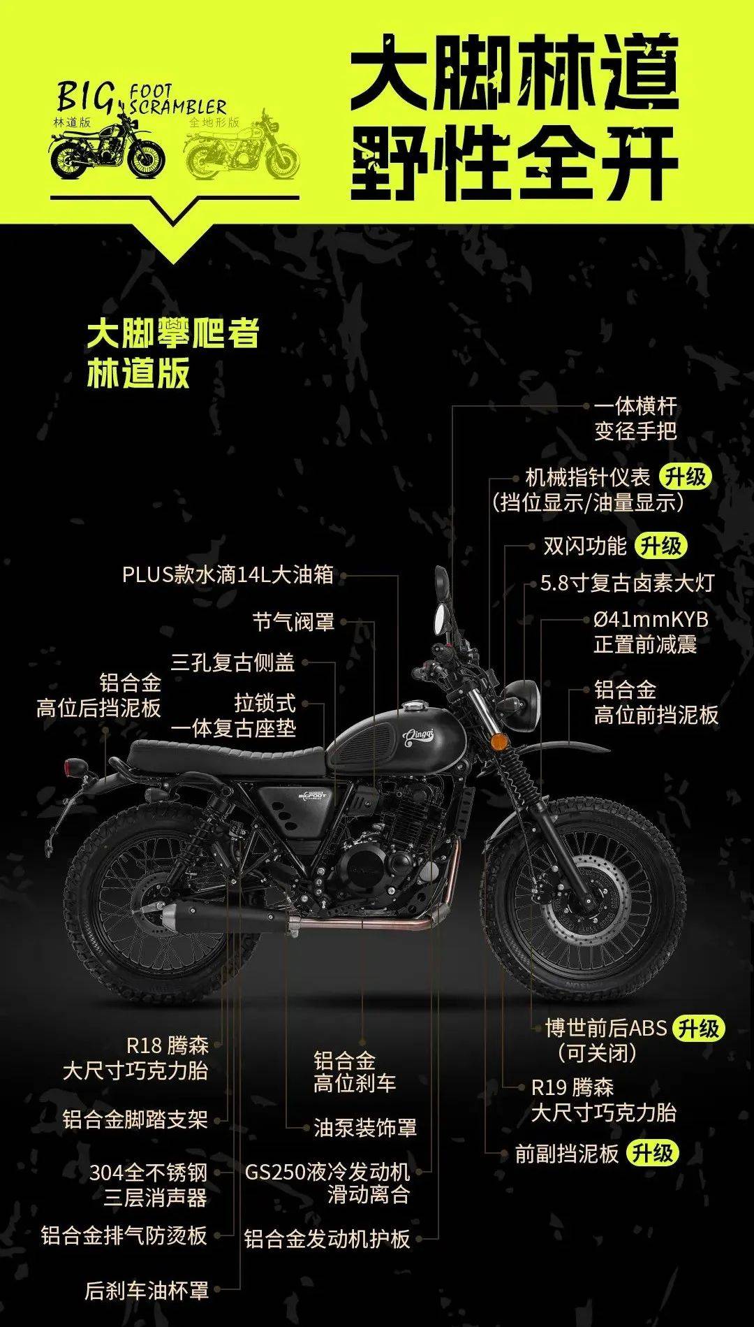 全地形版775座高,平直車把設計,160以上身高可輕松駕馭,主要配置有機械液晶儀表、前后17寸鋼絲輪、滕森龜背胎、不銹鋼消聲器、5.8寸復古鹵素大燈、可關閉的博世雙通達ABS、14升大油箱、快拆式側護板、拉鎖式一體菱形座墊等。林道版,815mm座高,采用一體橫桿變徑手把,相對以前的老款有四處升級,分別是可關閉博世前后ABS、雙閃、檔顯、前副擋泥板。與全地形版也有較多的差異,主要有前19后18的超大鋼絲輪轂,對應采用了前19后18滕森大尺寸巧克力胎;前減震改為41mmKYB正置前減,增加了鋁合金發(fā)動機底護板、鋁合金高位剎車、鋁合金高位前后擋泥板、前副擋泥、三孔復古側蓋,可以說兩個版本是兩款完全不同的車。兩個版本同時都有限時購車權益,即日起到6月25日24點下單,享199抵999及免費保養(yǎng)一次。