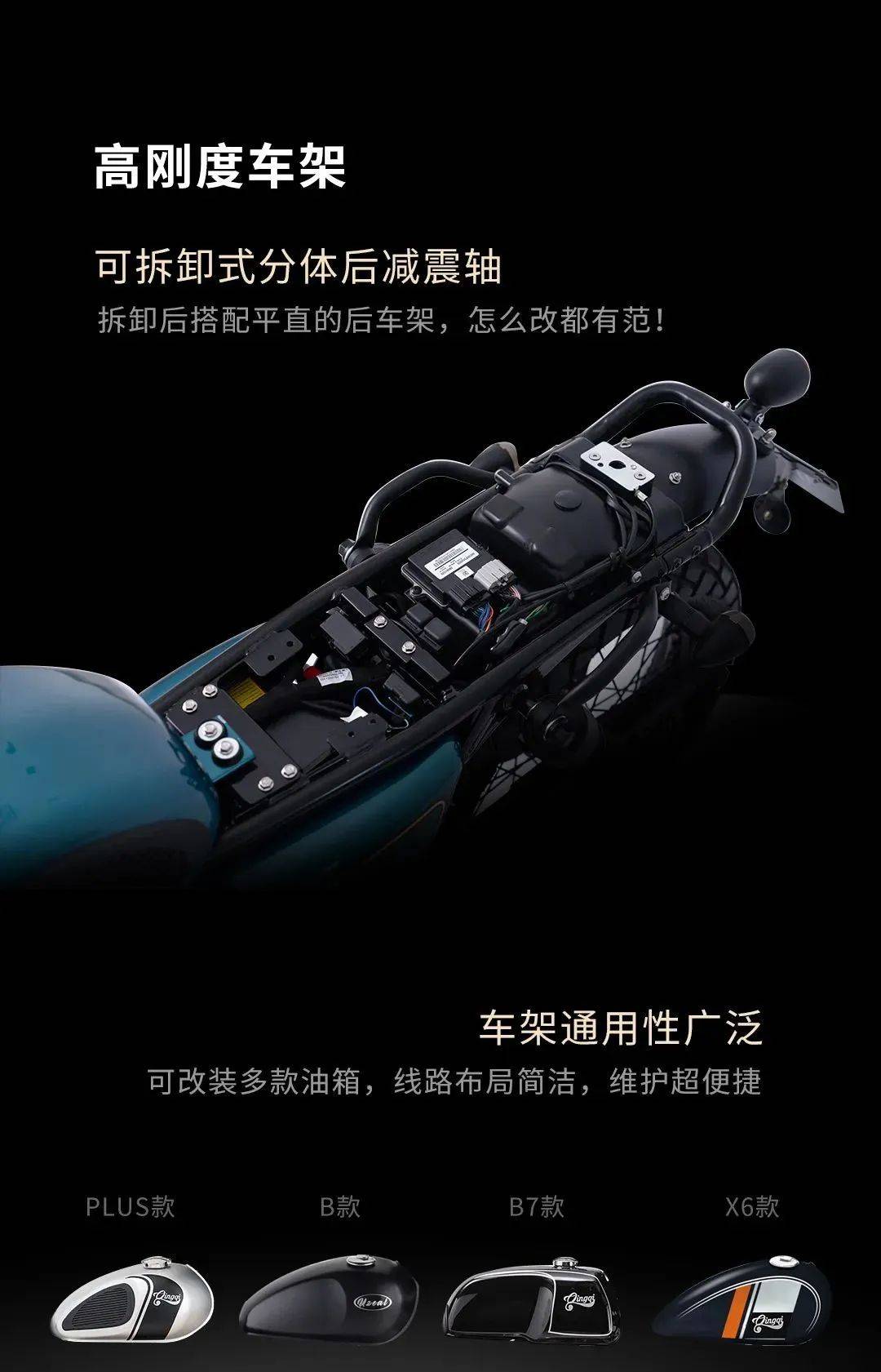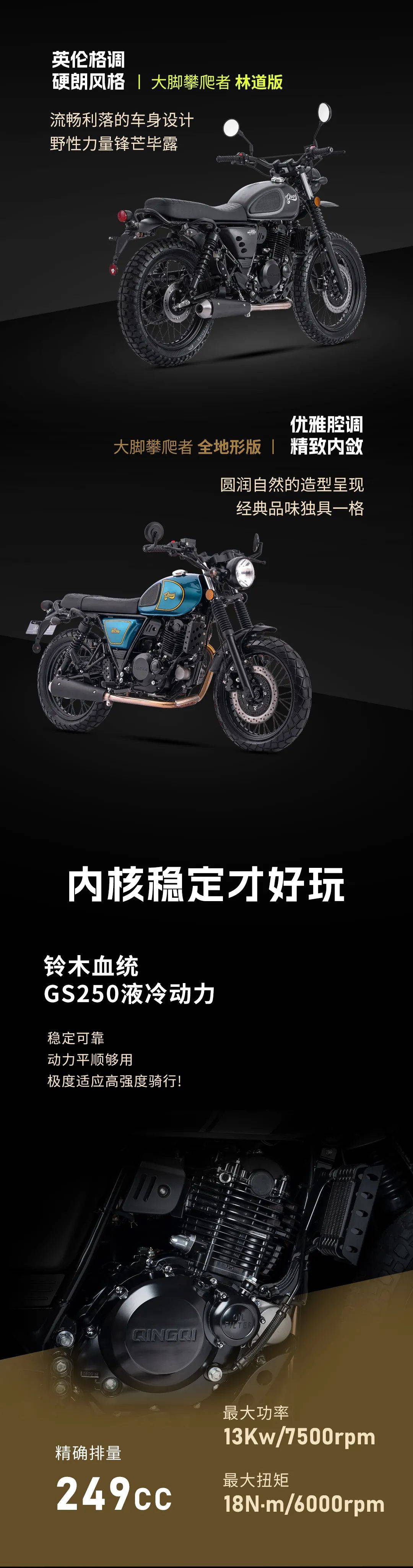 發(fā)動機采用鈴木血統(tǒng)的GS250單缸油冷發(fā)動機,最大功率13kW/7,500rpm,最大扭矩18Nm/6,000rpm,標配滑動離合器。這也是一款非常成熟的動力平臺,動力平順,高度穩(wěn)定耐用,無懼長時間高強度運行。既然是越野攀爬林道穿越,高強度車架是必須的,輕騎大腳攀爬者采用高強度鋼管車架,可拆卸式分體后減震軸,搭配平直后車架,確保高強度與改裝便利性??勺杂筛难b多款不同個性油箱,瞬間變體不同風格的大腳攀爬者。