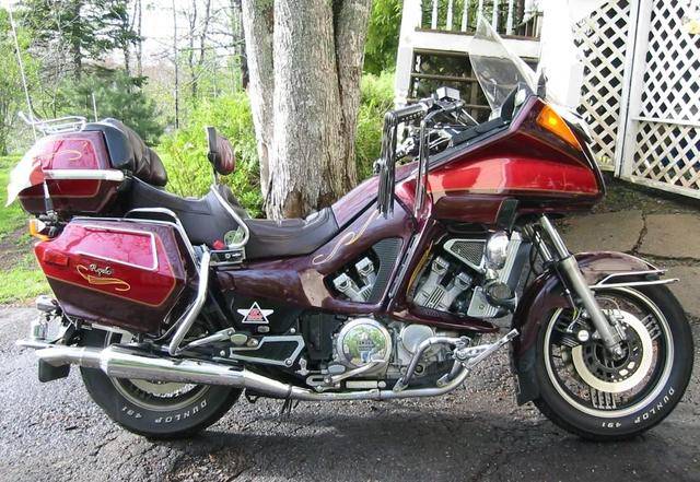 金翼率先開(kāi)辟了大型豪華旅行摩托車市場(chǎng)。當(dāng)然,市場(chǎng)是敏感的,就在金翼漸入佳境之際,競(jìng)爭(zhēng)隨之而來(lái),同行們敏銳地捕捉到市場(chǎng)的商機(jī),意識(shí)到這是一塊“大蛋糕”,因而加緊研發(fā)豪華旅行車,以爭(zhēng)搶市場(chǎng)份額。其中,雅馬哈迅速跟進(jìn),在1983年推出了Venture Royale,武裝了一臺(tái)水冷、70°夾角 V型四缸發(fā)動(dòng)機(jī),排量達(dá)到1198mL,比本田金翼多了113mL。而且,這臺(tái)V型四缸發(fā)動(dòng)機(jī)的技術(shù)含量比金翼更高,采用了雙頂置凸輪軸16氣門的汽缸頭,在4只等真空米尼庫(kù)化油器的配合下,能夠爆發(fā)67kW的最大功率,強(qiáng)大的動(dòng)力讓體重340kg的Venture Royale迅猛加速,0-400米加速只需13秒左右,終點(diǎn)速度167km/h,比金翼來(lái)得兇猛。Venture Royale同樣定位于豪華旅行車,V型四缸運(yùn)轉(zhuǎn)平靜安穩(wěn)、扭矩充沛,適合滿載輜重長(zhǎng)途跋涉,在最高擋以100km/h速度行駛時(shí),轉(zhuǎn)速只有3400r/min;動(dòng)力儲(chǔ)備豐沛,長(zhǎng)時(shí)間高速奔馳效能不衰減,極速可達(dá)220km/h;20升的大容積油箱支持長(zhǎng)途續(xù)航,加滿油后可以行駛360千米;裝備了空氣調(diào)節(jié)的懸掛系統(tǒng),40mm的前叉還具備防俯沖功能,再加上座位寬大舒適,車把、乘客腳踏板等都可以調(diào)節(jié),能夠讓騎手減輕疲勞;而且,寬敞的行李箱、CB天線、大型擋風(fēng)板等長(zhǎng)途配置一應(yīng)俱全,可謂是競(jìng)爭(zhēng)力十足!
