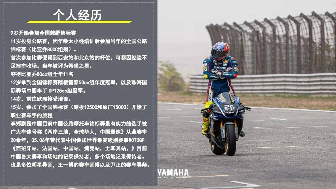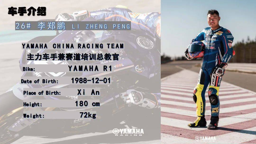 26號李鄭鵬是現(xiàn)役中國多個場地1000cc最快圈速紀錄的保持者,被廣大車迷譽為“兩岸三地,全球華人,中國最速”。 在20余年的賽道生涯中,李鄭鵬身經(jīng)百戰(zhàn),榮譽等身,曾代表中國征戰(zhàn)世界頂級賽事MotoGP 250cc組別,他在傳道授業(yè)上也頗有建樹,多年來他擔(dān)任多位知名明星車手的導(dǎo)師。他的加入,將為雅馬哈中國賽車隊注入強勁動力。