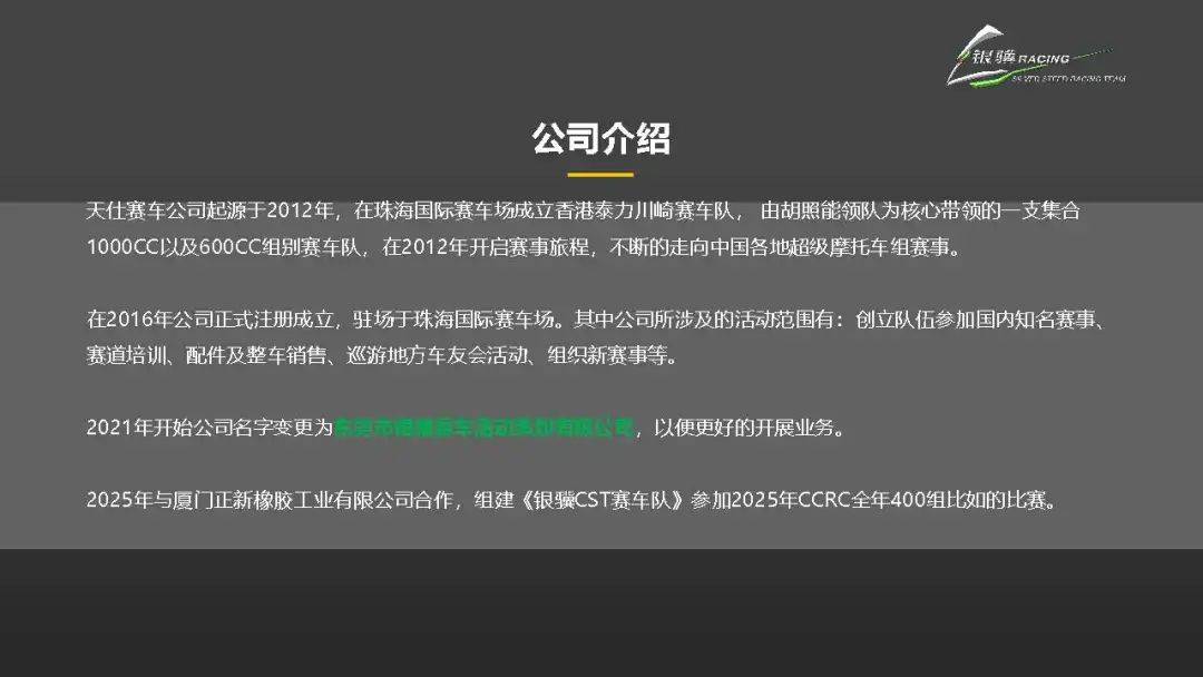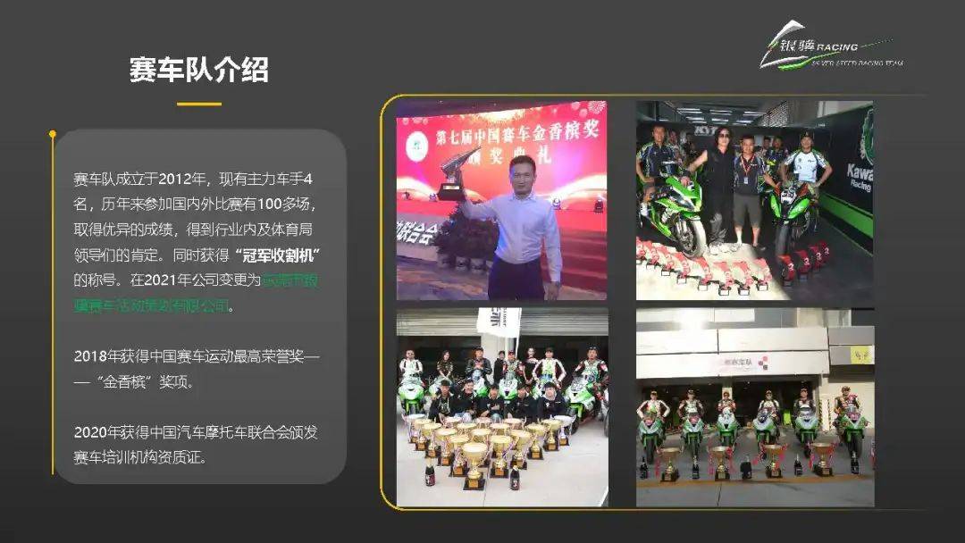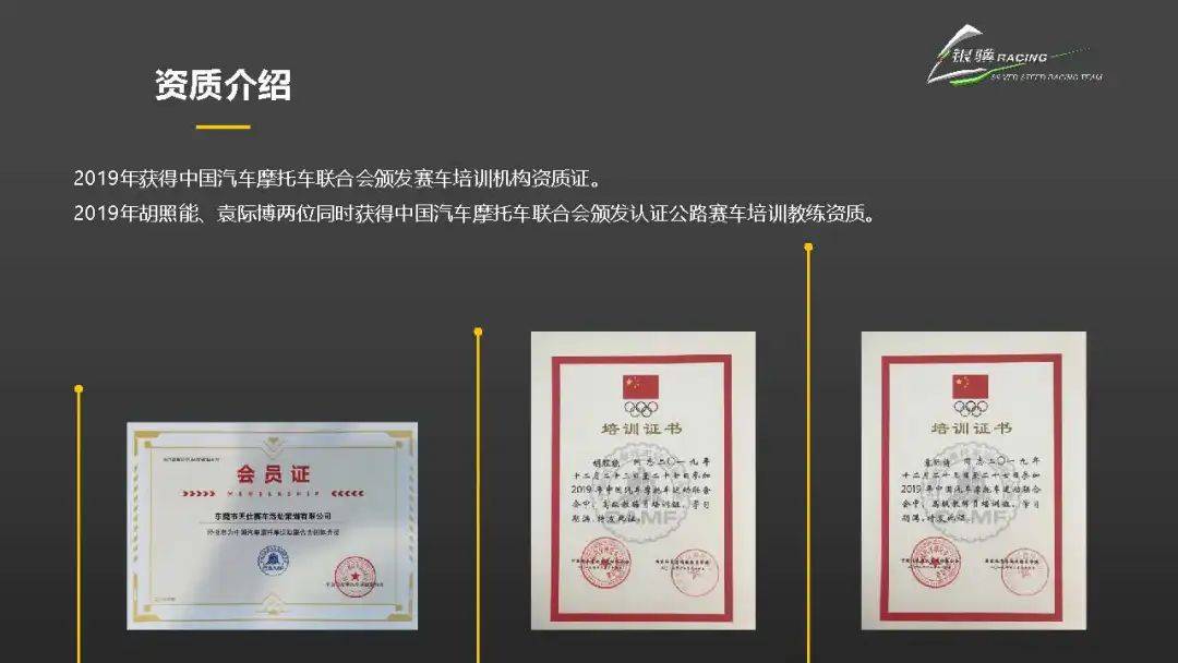 車隊由東莞市銀驥賽車活動策劃有限公司運營,于2020年獲得中汽摩聯(lián)官方頒發(fā)的賽車培訓機構(gòu)資質(zhì)證書,為中國摩托車賽事新生力量的培育注入堅實力量。