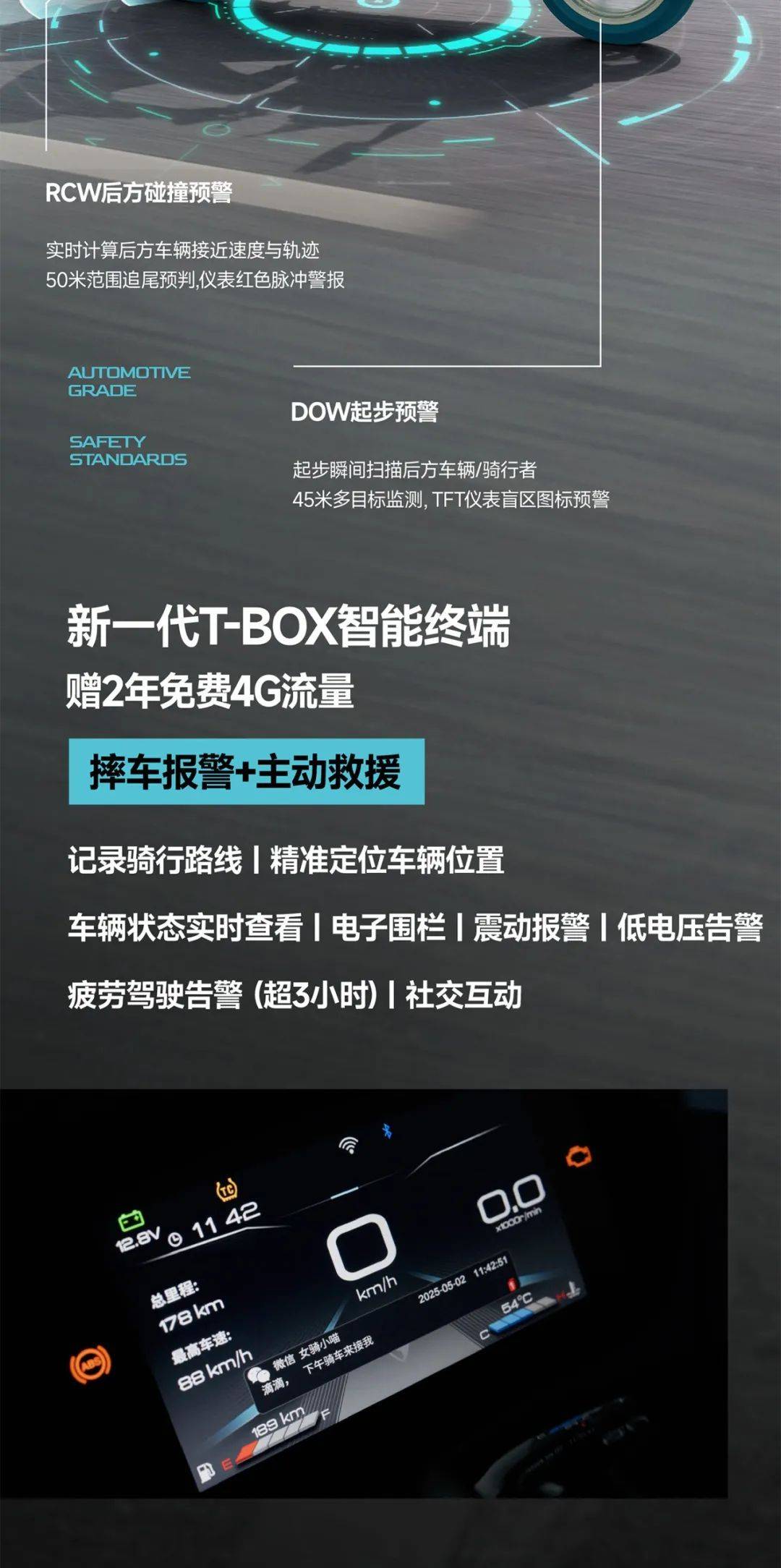 新一代T-BOX智能終端還提供摔車報(bào)警、緊急救援等十余項(xiàng)功能,安全防護(hù)堪比豪華轎車。