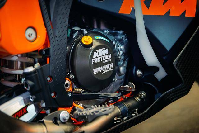 市售規(guī)格的 2026 款 450 Rally Replica 復(fù)制版拉力賽車、基于此前發(fā)售的 2025 款修改而成,搭載一副水冷四沖程單氣缸、SOHC 四氣閥、排氣量 449.3 cc 的發(fā)動(dòng)機(jī),為對(duì)應(yīng)拉力賽的使用場(chǎng)景、該車配備了六檔的變速齒輪箱(同動(dòng)力平臺(tái),MX 場(chǎng)地越野版的 450 SX-F 和 Enduro 規(guī)格的 450 EXC-F 均采用五檔的變速齒輪箱),經(jīng)過(guò)強(qiáng)化的離合器,兩個(gè)獨(dú)立的散熱器以確保有更大的冷卻效率。