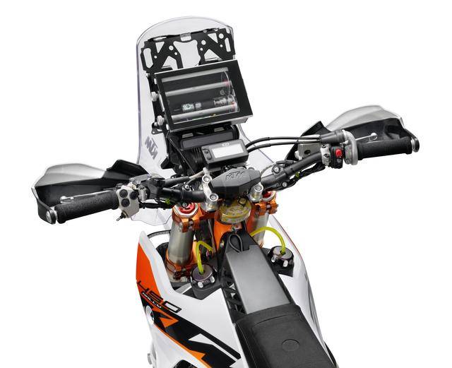 車體采用一副鋼制的車架、鋁合金制的后搖臂,WP 配套的懸掛系統(tǒng),前面是 XACT Pro 7548 倒立式前叉、后面是 XACT Pro 7750 后減震;CNC 制的上下三星(前叉三角臺(tái)),車頭的前部整流罩針對(duì)空氣動(dòng)力學(xué)而設(shè)計(jì),碳纖維制的輕量化導(dǎo)航塔臺(tái),LED 作為光源的前大燈;三個(gè)油箱的設(shè)計(jì),總共可攜帶大約 34.5 公升的燃料,其中帶外部容量刻度的主油箱、其容量為 16 公升,兩個(gè)副油箱的容量分別為 9 公升、9.5 公升;前 21、后 18 英寸直徑的輪框,Brembo布雷博的前后剎車卡鉗、Galfer 的波浪式前后剎車碟;標(biāo)配了發(fā)動(dòng)機(jī)底部的大型護(hù)罩、Scotts 的轉(zhuǎn)向阻尼器。