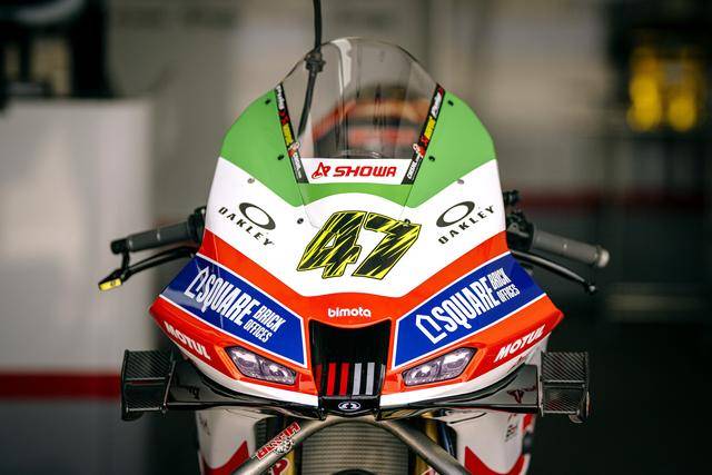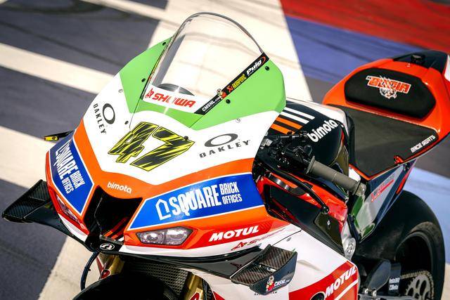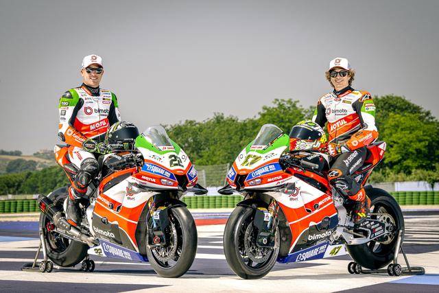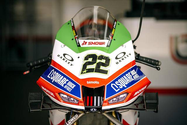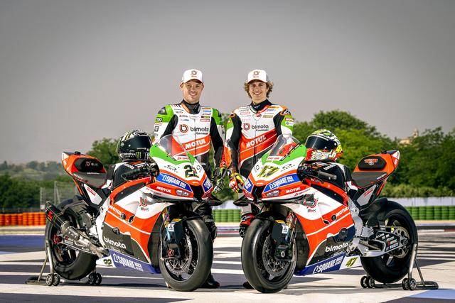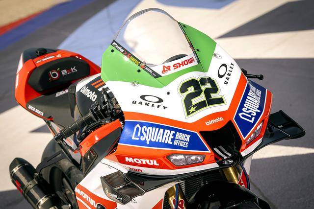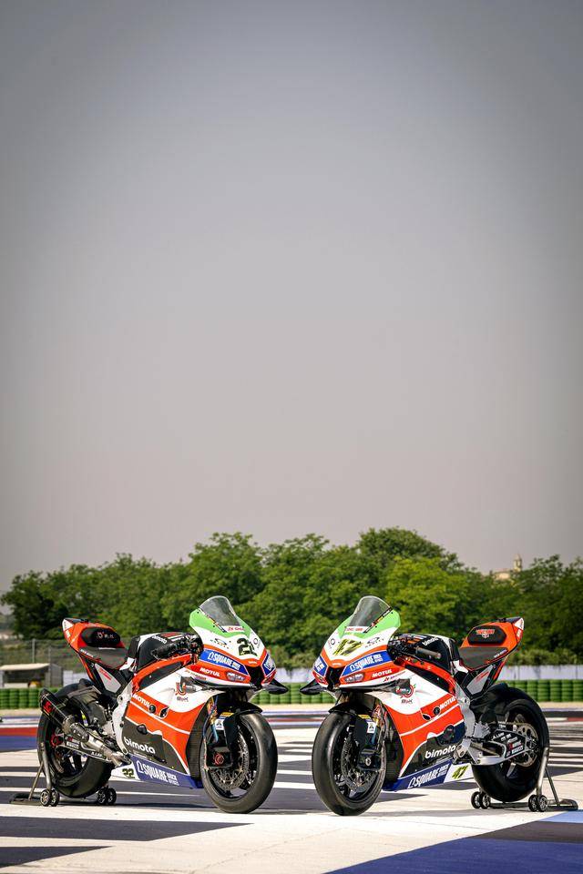 車隊的比摩塔 KB998 Rimini WorldSBK 工廠賽車上,車頭的頂部整流罩、換上了綠色的貼花,與車身原有的白色、紅色相呼應(yīng),從而展現(xiàn)出一個意大利國旗色彩的風(fēng)格。此外,車隊的兩位車手,駕駛 22 號車的英國車手洛維斯(Alex Lowes)以及 47 號車的意大利車手巴薩尼(Axel Bassani),其皮衣上、在肩膀附近的位置上也對應(yīng)地增加了綠色的貼花。