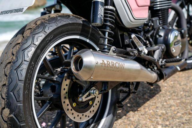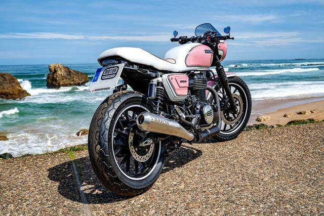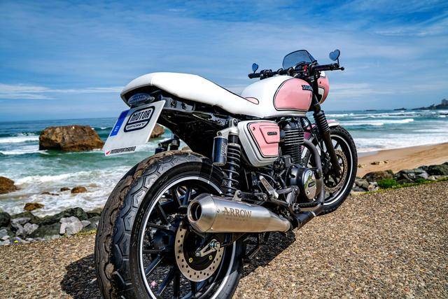 下面的圖片,是來(lái)自西班牙經(jīng)銷商 Honda Motorsport Las Rozas 的 GB350S 定制車,作品名為米蘭達(dá)(Miranda),這也是本項(xiàng)目負(fù)責(zé)人七歲女兒的名字。此外,該作品也是由全女性的團(tuán)隊(duì)設(shè)計(jì),白色與糖果粉紅色的復(fù)古混合風(fēng)格,很好地體現(xiàn)了其特點(diǎn)。其他的硬件上,作品換上了 Arrow 的排氣系統(tǒng)、YSS 的后減震,新的前大燈罩、心形外觀的后視鏡,以及白色 + 粉紅色面料的鞍座。