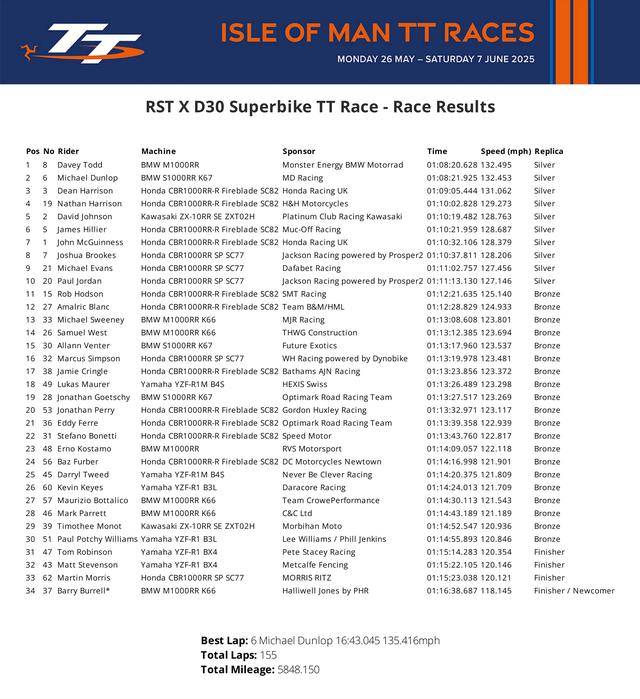 焦點的 Superbike TT,駕駛 8 號車的托德(Davey Todd。BMW Motorrad M 1000 RR)奪得了冠軍;駕駛 6 號車的 M. 鄧祿普(Michael Dunlop。BMW Motorrad S 1000 RR)獲得了亞軍;3 號車的哈里森(Dean Harrison。Honda CBR1000RR-R SP)拿到了季軍。