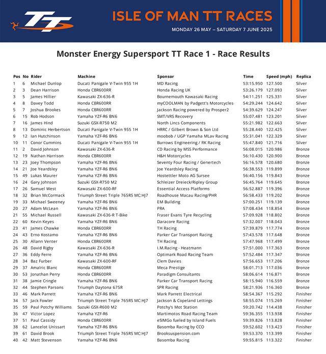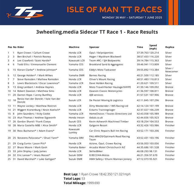 下面的圖片,依次為 Supertwin TT 超級雙缸組、Supersport TT 組、Superstock TT 組、Superbike TT 組以及 Sidecar TT 組的賽事成績。