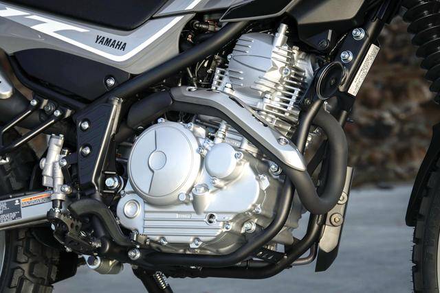 面向美國市場的 2023 - 2025 XT250S 搭載一副風(fēng)冷四沖程單氣缸、SOHC 兩氣閥的發(fā)動機(jī),缸徑、行程為 74 mm x 58 mm,排氣量 249 cc,配備了 YFI 電子燃油噴注系統(tǒng)、五檔的變速齒輪箱,最大動力輸出 14 kw(約 18 匹)。這副動力單元,與國產(chǎn)的天劍王 250、飛致 YS250 是相同平臺的機(jī)器。除了用于 XT250S 之外,目前南美洲市場在售中的多個 250 型號,也是采用這副動力裝置(譬如面向巴西市場的探險車 XTZ250 Lander)。