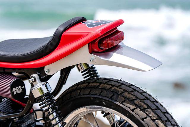 下面的圖片,是來自英國 Vertu Honda 公司的參賽作品 FTR。作品的設(shè)計靈感、來源于 Flat Track 平地泥路賽車,車體采用了極簡主義的風(fēng)格,一個新的、上翹的鞍座,用來延續(xù)油箱的線條;前大燈被拆除、取而代之的是一個賽車數(shù)字號碼牌;車身采用紅色作為主色調(diào),輔以白色、黑色和藍色的線條,結(jié)合黑色的車架、發(fā)動機,以突顯出經(jīng)典的賽車風(fēng)格。