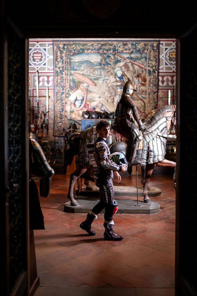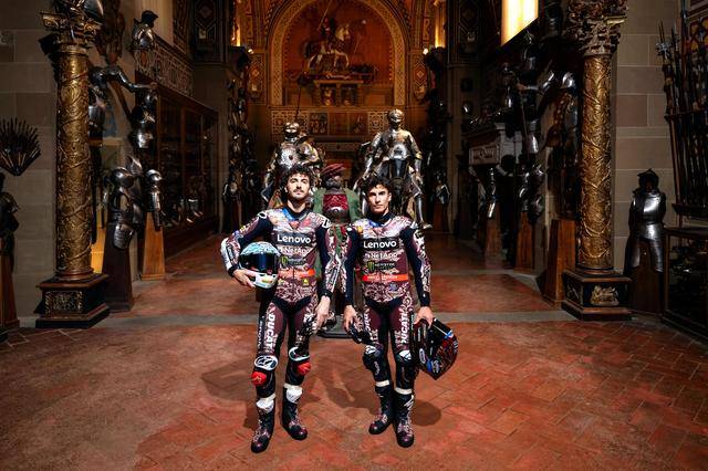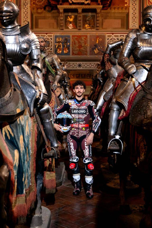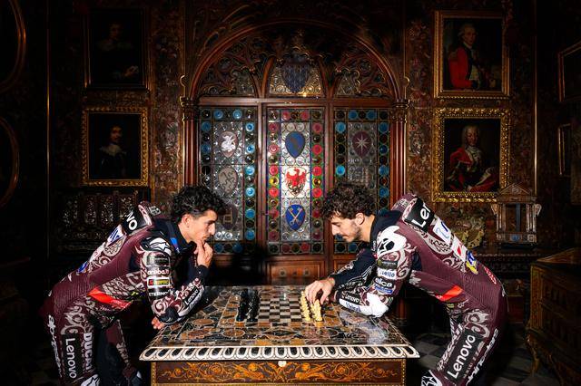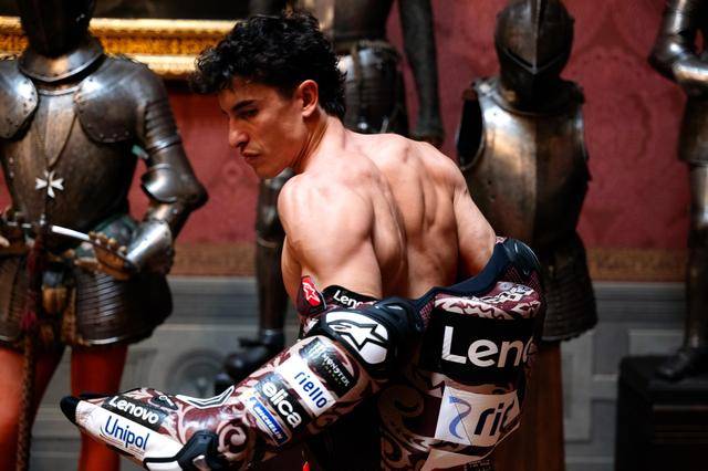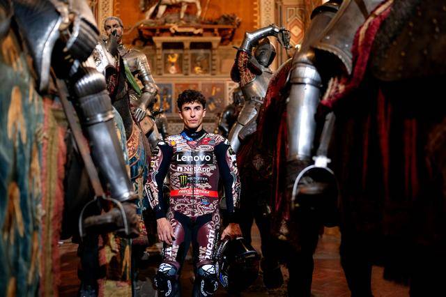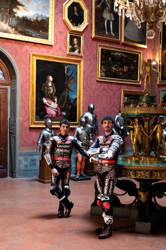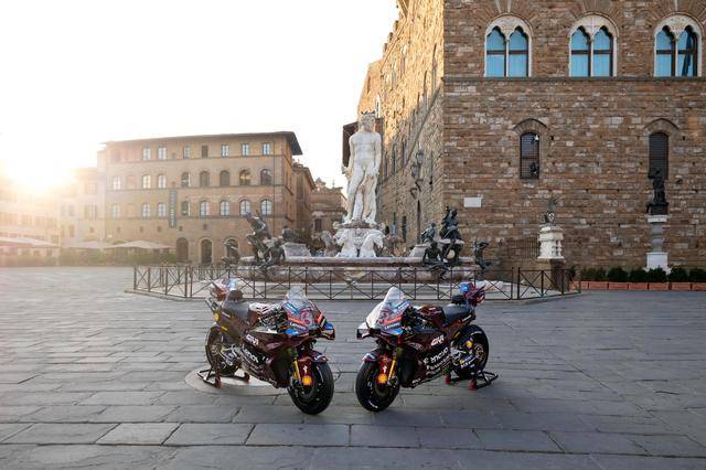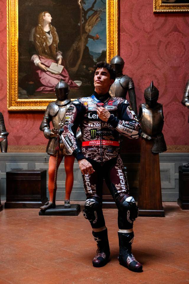 杜卡迪稱,意大利站的這個(gè)特別圖案受到達(dá).芬奇(Leonardo da Vinci)著名畫作《古代船長(zhǎng)》的啟發(fā),德魯?shù)弦詣?dòng)態(tài)和現(xiàn)代的方式、重新詮釋了這幅圖像,兩位工廠車隊(duì)的車手,巴納亞(Francesco Bagnaia)和馬昆斯(Marc Marquez)被重新詮釋為現(xiàn)代騎士,而 Desmosedici GP25工廠賽車則是代表了他們的當(dāng)代駿馬。新的這個(gè)特殊圖案,將美輪美奐和獨(dú)創(chuàng)性融合在一起,向文藝復(fù)興的搖籃、和意大利創(chuàng)意天才象征的佛羅倫薩致敬。