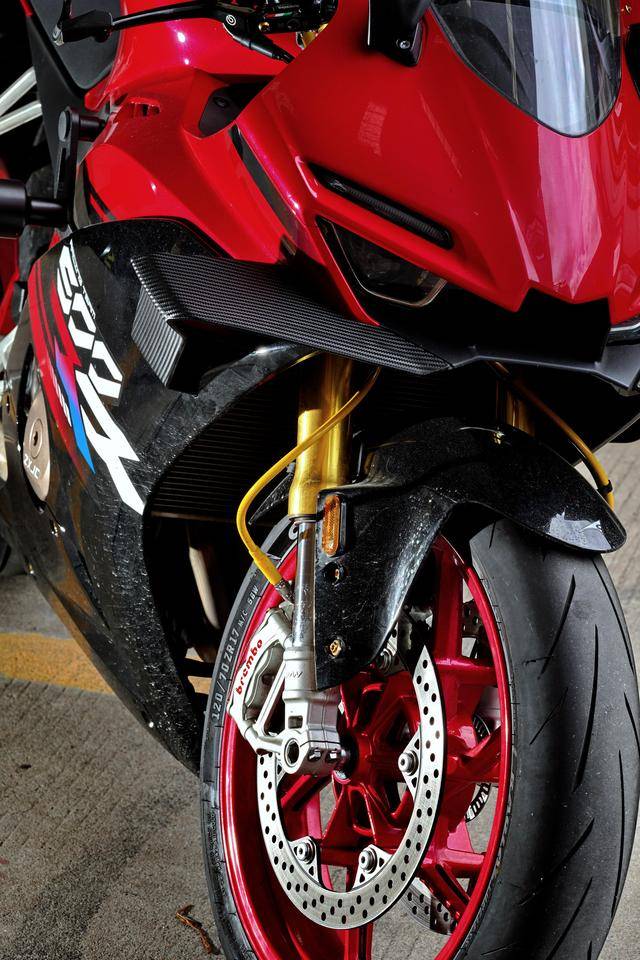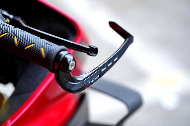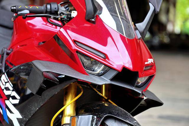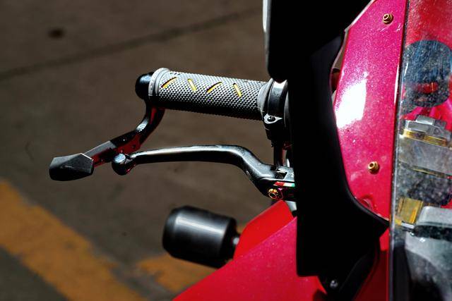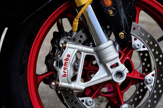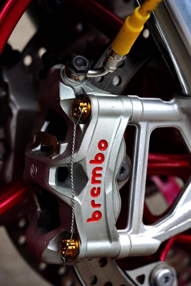下圖的這輛經(jīng)過小幅度修改的 500RR 是后單搖臂版,一對徑向安裝的 Brembo 布雷博前剎車卡鉗、以及 RCS 上剎車泵,是這輛 “ 怡情小改 ” 之跑車的焦點;輔以輕量化的金色螺栓、Moto-Tron 的離合器拉桿(離合牛角)和護弓、防摔護桿等作為點綴 —— 再改下去,既難以在國內(nèi)當(dāng)前的公共道路上 “ 免檢 ”、其成本也將輕松超越購車的金額。