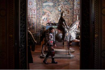 兩位車手身著紳士裝束,步入文藝復(fù)興珍藏的殿堂——斯蒂貝爾特博物館,轉(zhuǎn)身化身為現(xiàn)代騎士。四周環(huán)繞的古代鎧甲仿佛重獲生機(jī),而他們佩戴的頭盔、賽服與手套,則以當(dāng)代設(shè)計(jì)語(yǔ)言重新演繹了文藝復(fù)興的美學(xué)符號(hào),讓歷史與現(xiàn)代在賽道裝備上完成對(duì)話。