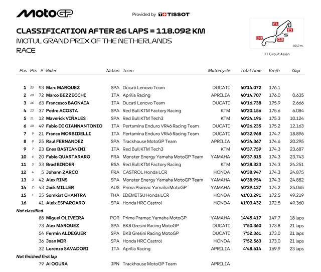 盡管一直緊隨在領(lǐng)先者的后面,但從第 8 圈開始就上升到第二位的貝澤奇、一直難于對(duì)前面的馬昆斯策動(dòng)有效的攻擊。最終,馬昆斯奪得了荷蘭站正賽的冠軍,貝澤奇獲得了亞軍,巴納亞拿到了季軍。