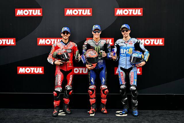 MotoGP 級(jí)別、賽前的 Q2 排位,駕駛 20 號(hào)車的法國車手夸塔拉羅(Fabio Quartararo)以 0.0285 秒的優(yōu)勢(shì),拿到了排頭位發(fā)車;后面,63 號(hào)車的意大利車手巴納亞(Francesco Bagnaia)、73 號(hào)車的小馬昆斯(Alex Marquez)分別占據(jù)第一排發(fā)車位置的其余兩席。