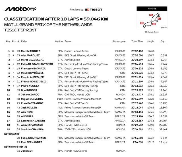 賽程為 13 圈的 Sprint短途沖刺賽,駕駛 93 號(hào)車的馬昆斯(Marc Marquez)很快就取得了領(lǐng)先的位置,僅僅是到第 2 圈、從第一位出發(fā)的夸塔拉羅就掉到了第四;大部分的比賽時(shí)間里,冠軍之爭(zhēng)仍與此前的沖刺賽一樣,焦點(diǎn)落到了馬昆斯兄弟倆的追逐上。最終,馬昆斯率先沖線、連續(xù)第三場(chǎng)拿到?jīng)_刺賽的冠軍,相差僅僅約 0.3 秒、小馬昆斯獲得了第二,兄弟倆再次包辦了冠、亞軍;駕駛 72 號(hào)車的意大利車手貝澤奇(Marco Bezzecchi)奪得了第三名。