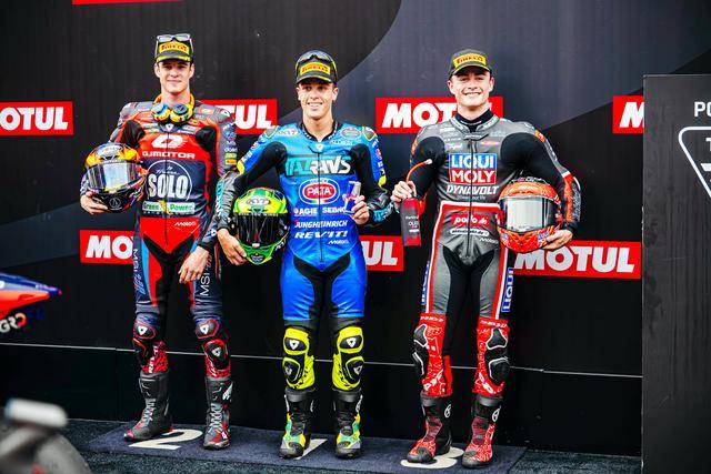 Moto2 級(jí)別,從排頭位起跑、駕駛 10 號(hào)車的巴西車手莫雷拉(Diogo Moreira),與第四位發(fā)車、駕駛 44 號(hào)車的西班牙車手卡內(nèi)特(Aron Canet),自比賽的第 2 圈開(kāi)始、就一直糾纏至最后沖線,兩人的激烈交鋒、最終以 0.056 秒之差分出了勝負(fù):莫雷拉奪得了冠軍,拿到了升級(jí)到 Moto2 級(jí)別之后的首場(chǎng)勝利;卡內(nèi)特獲得了亞軍,另一位西班牙車手、駕駛 18 號(hào)車的岡薩雷斯(Manuel Gonzalez)拿到了季軍。