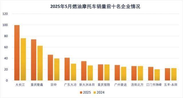 從企業(yè)層面來看,1-5月,燃油摩托車銷量前十名企業(yè)(集團)為大長江、隆鑫、宗申、廣東大冶、新大洲本田、重慶銀翔、廣州豪進、洛陽北方、江門市珠峰、五羊-本田,分別銷售99.69萬輛、74萬輛、46.32萬輛、41.01萬輛、34.85萬輛、29.04萬輛、27.99萬輛、25.99萬輛、24.5萬輛和22.25萬輛。電動摩托車銷售前十名企業(yè)(集團)為雅迪科技集團、浙江綠源、宗申、江蘇新日、春風動力、江蘇淮海、巴士新能源、五星車輛、隆鑫、臺鈴,分別銷售44.65萬輛、19.89萬輛、19.08萬輛、10.44萬輛、9.33萬輛、6.89萬輛、6.29萬輛、3.47萬輛、3.04萬輛和2.52萬輛。這些頭部企業(yè)憑借品牌、技術和渠道優(yōu)勢,在市場競爭中占據(jù)有利地位,引領行業(yè)發(fā)展。
