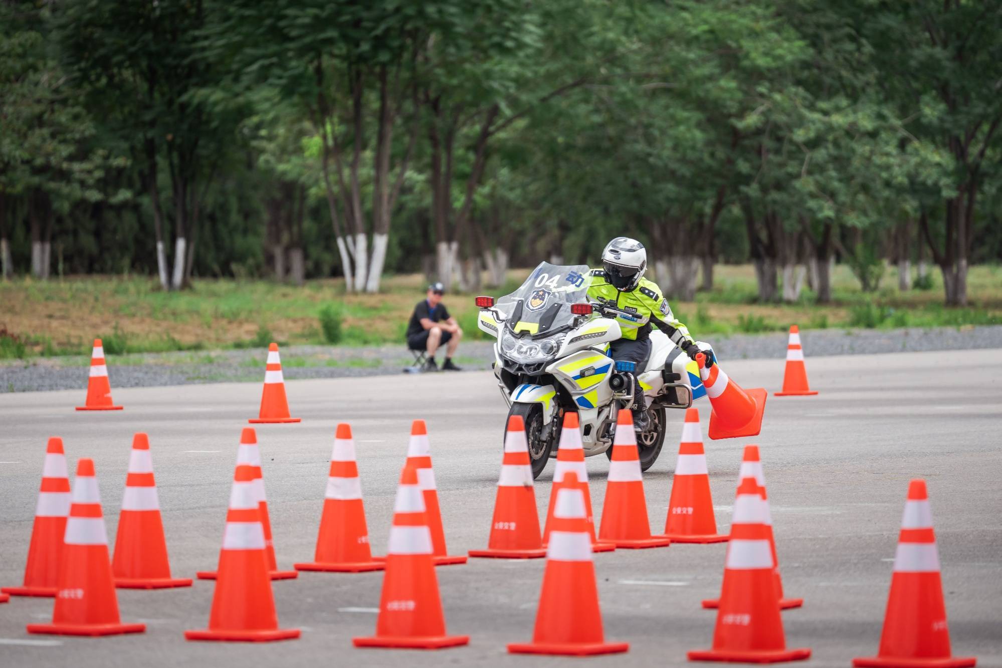 此次競賽分為個人賽和團體賽兩個部分,圍繞摩托車駕駛場景和技能需求,設計了單桶S繞樁駕駛、窄路直行駕駛、單手控車駕駛、雙桶繞樁駕駛、限寬掉頭駕駛、Z字繞樁駕駛、十字繞樁駕駛等多種比賽科目。這些項目不僅要求參賽選手逐項闖關、一氣呵成,更要求選手們不能碰倒路障樁及樁上小球,這對參賽隊員的心理素質(zhì)和駕駛技能都是一種很大考驗。比賽科目緊貼公安實戰(zhàn)需求,突出機動靈活和快速反應兩大特點,全面檢驗參賽隊員在復雜道路情形下的快速通過能力。