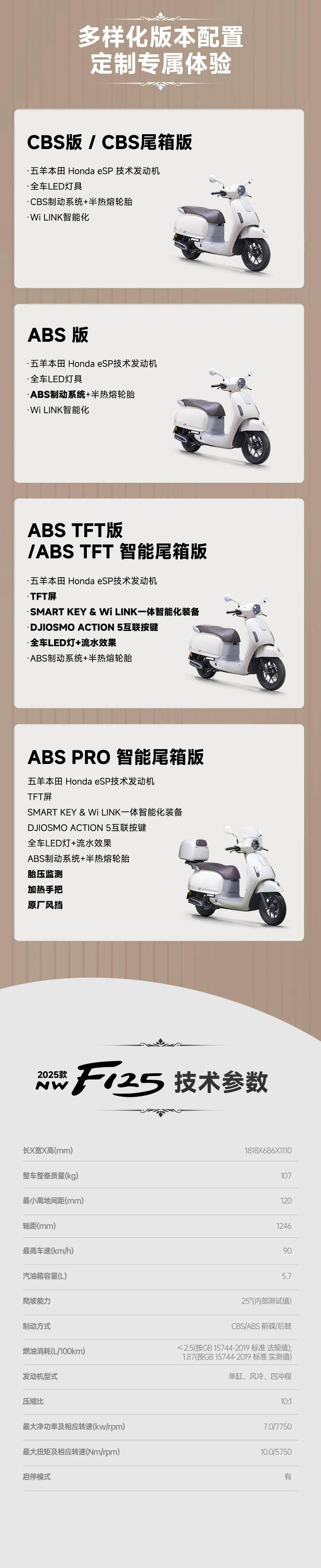 7 月 5 日消息,五羊本田 F125 復古踏板 2025 款車型昨日宣布上市,CBS 基礎版售價 9980 元,搭載智能尾箱、胎壓監(jiān)測、加熱手把的 ABS PRO 頂配版本 13400 元。