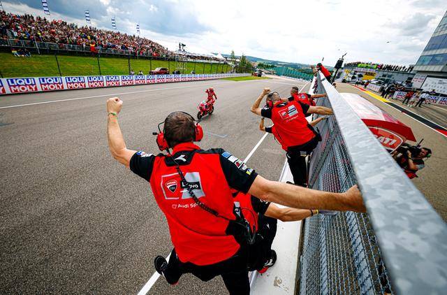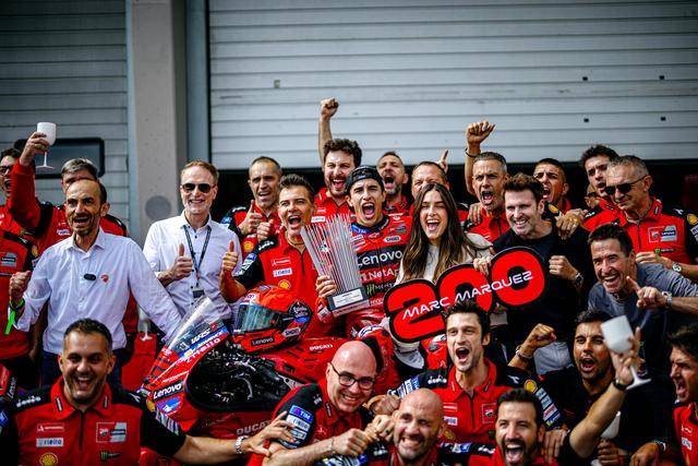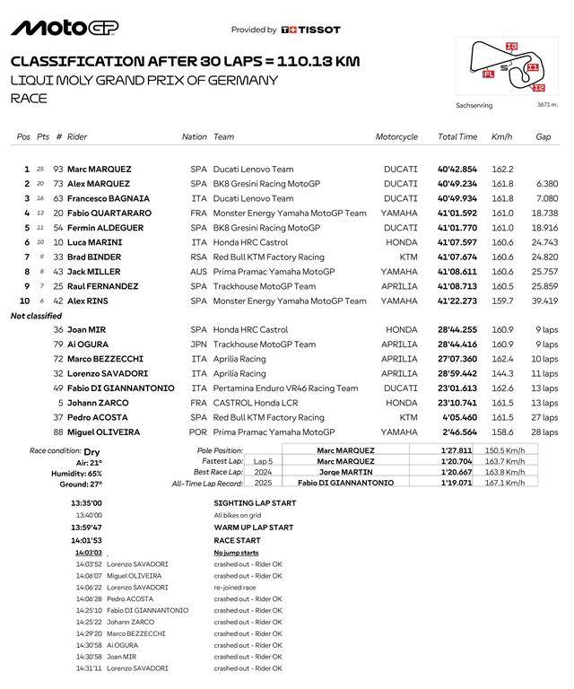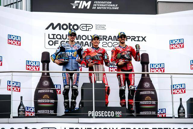 駕駛 73 號車的小馬昆斯(Alex Marquez)獲得了亞軍,帶傷上陣的他、落后哥哥 6 秒多,以登上頒獎臺去慶祝他的第 100 場最高級別的比賽;后面,63 號車的意大利車手巴納亞(Francesco Bagnaia)拿到了季軍。而多達八位車手先后退賽、讓場上最后只剩下十位車手在飛馳,稱得上是 2025 德國站 MotoGP 級別正賽的另一個焦點。