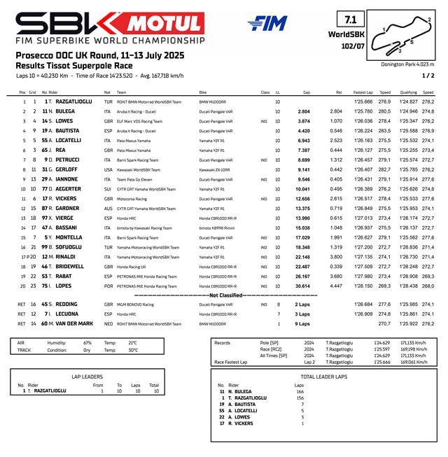 賽程為 10 圈的超級排位賽正賽(Super Pole Race),拉格里奧盧在發(fā)車之后就取得了領(lǐng)先位置,除了前 2 圈受到本土作戰(zhàn)的、65 號車的雷亞(Jonathan Rea)窮追不舍之外,其余的比賽時間里、拉格里奧盧的領(lǐng)先地位都沒有受到威脅 —— 在第 3 圈開始的持續(xù)猛推,讓他擺脫了對手們的糾纏。