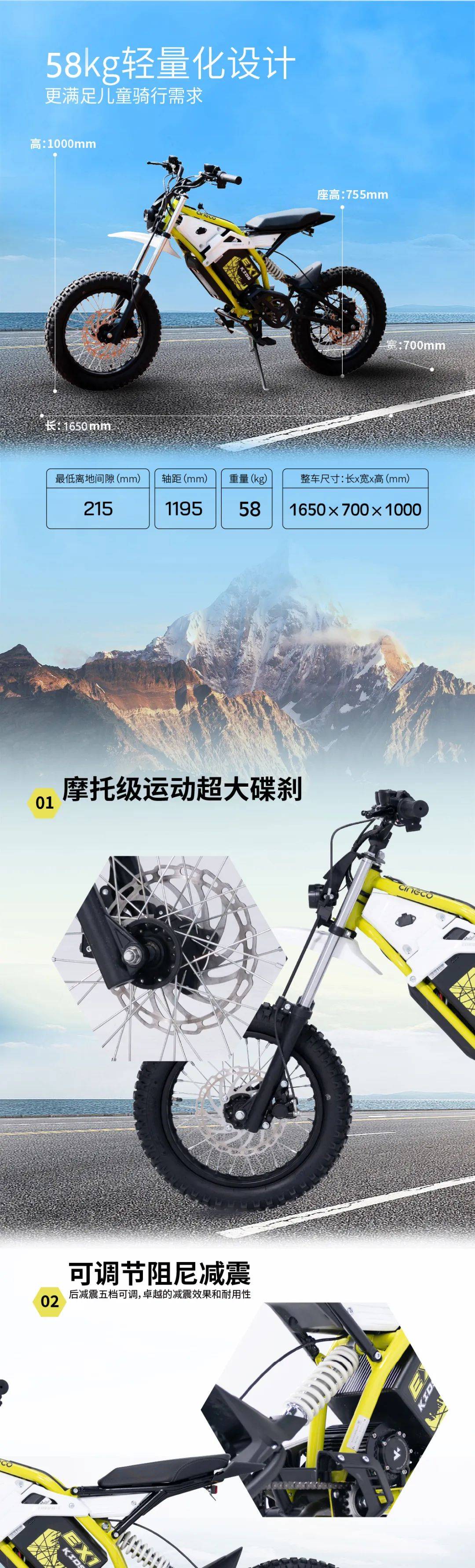 整備質(zhì)量?jī)H58公斤,1825mm車(chē)長(zhǎng)1195mm軸距,可以作為青少年入門(mén)訓(xùn)練用車(chē),或身材嬌小女性愛(ài)好者駕馭。400W峰值1500W中置電機(jī),最大扭矩120牛米,適應(yīng)越野,最高時(shí)速45,20安時(shí)磷酸鐵鋰電池、森藍(lán)專用FOC矢量控制器、超大前碟剎,安全駕馭。3.0-14寬胎輻條輪組,搭配正置液壓前減震和鋼管后搖臂中置直連單減震結(jié)構(gòu),后減震具備5級(jí)預(yù)載調(diào)節(jié)功能,能夠較好的適應(yīng)不同年齡段和體重范圍的駕駛者。首發(fā)零售價(jià)5699元,性價(jià)比突出。