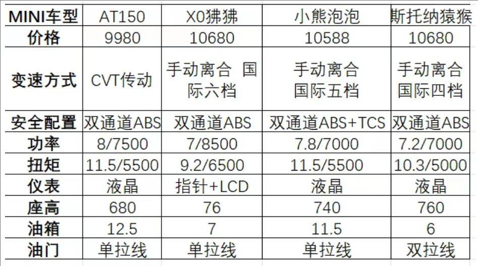 與幾款同類MINI車對(duì)比,AT150動(dòng)力上略有優(yōu)勢(shì),價(jià)格也低700元左右,油箱容積最大,續(xù)航里程最長。最重要的是AT150是唯一采用150騎士發(fā)動(dòng)機(jī)+CVT傳動(dòng),而非150踏板發(fā)動(dòng)機(jī)或帶檔位的發(fā)動(dòng)機(jī)。