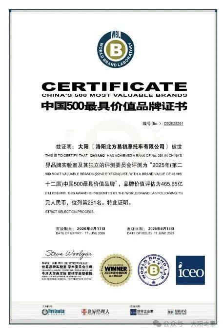 “大陽”品牌——為中國摩托車十強品牌,品牌價值465.65億元(2025年《中國500最具價值品牌》第261位),是摩托車行業(yè)僅有的兩家中國500最具價值品牌之一,先后獲得中國馳名商標、全國重點保護商標等稱號。
