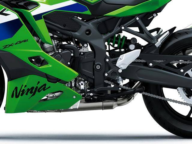 2026 Ninja ZX-4R/ZX-4RR 搭載一副水冷四沖程直列四氣缸、DOHC每氣缸四氣閥的發(fā)動(dòng)機(jī),排氣量 399 cc,峰值動(dòng)力輸出 77 匹(常規(guī)狀態(tài))、80 匹(Ram Air 沖壓進(jìn)氣狀態(tài))。車體采用一副鋼管制車架,叉芯口徑為 37 mm 的倒立式前叉,TFT 全彩色數(shù)字式儀表板等。與現(xiàn)行的 2025 款相比,2026 Ninja ZX-4R/ZX-4RR 主要的變化是換了新的車身圖案/貼花,其中一個(gè) RR 版的貼花、采用了與 Kawasaki 在 WorldSSP 里面的賽車相近的配色方案。