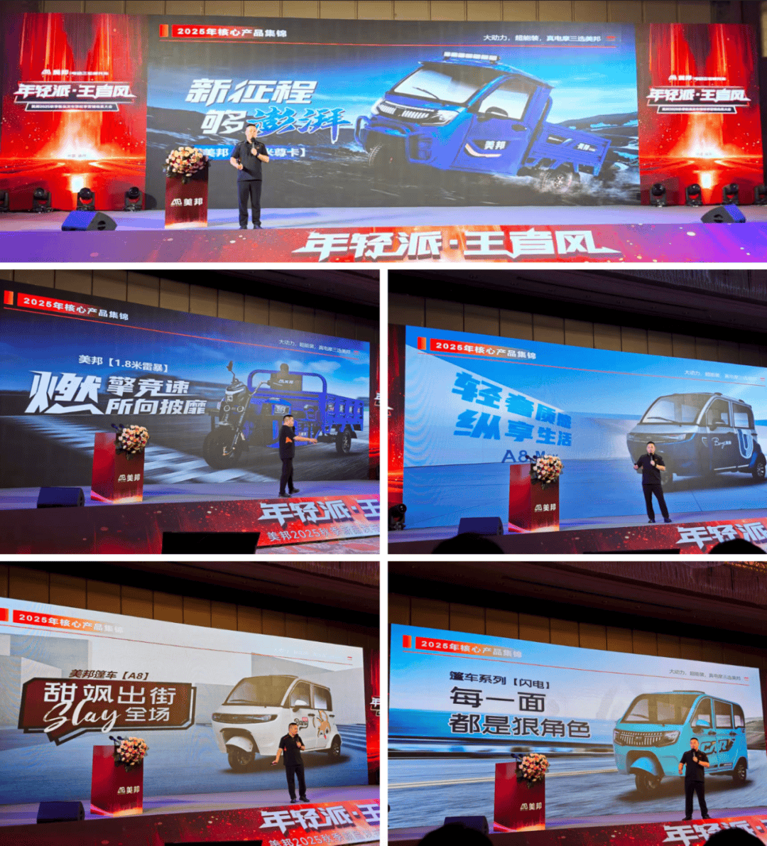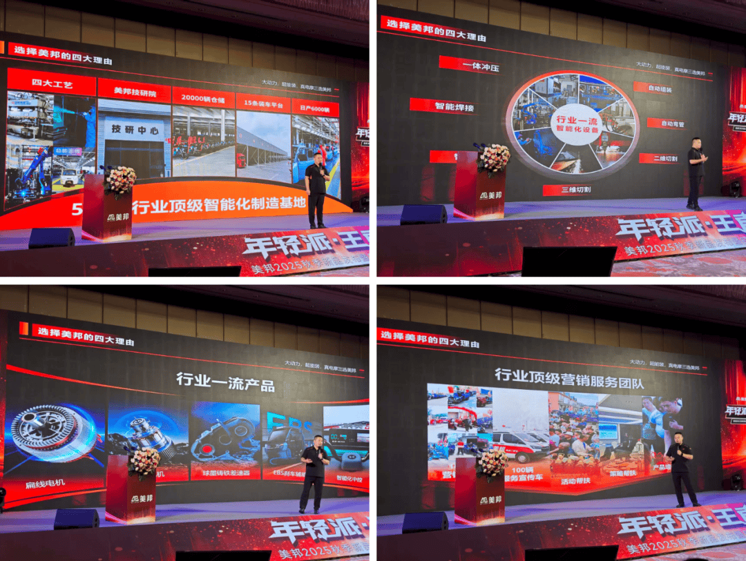 郭總表示,目前行業(yè)發(fā)展的痛點,在于缺乏真正懂經銷商、能給經銷商事業(yè)保駕護航、真正懂得市場需求的品牌。美邦電三依托集團“市場驗證”,矩陣車型均經過市場爆款認證,上市即成“硬通貨”。隨后郭總向與會經銷商詳細講解此次會議發(fā)布的新品。從貨三到篷三,再到即將上市的休三,美邦電三產品均有明確開發(fā)目的,不構想市場期待,美邦“滿配”產品將讓每一名合作商家都能拿到“正確答案”。