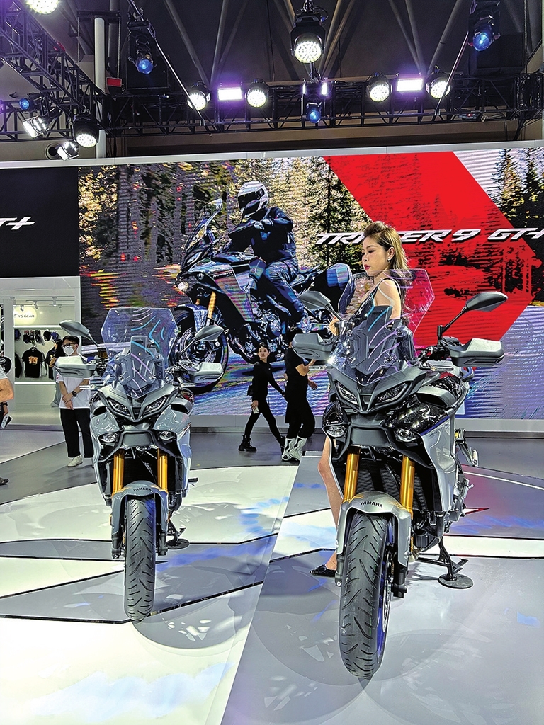 “摩博會(huì)”上,車模在展示新款摩托車。